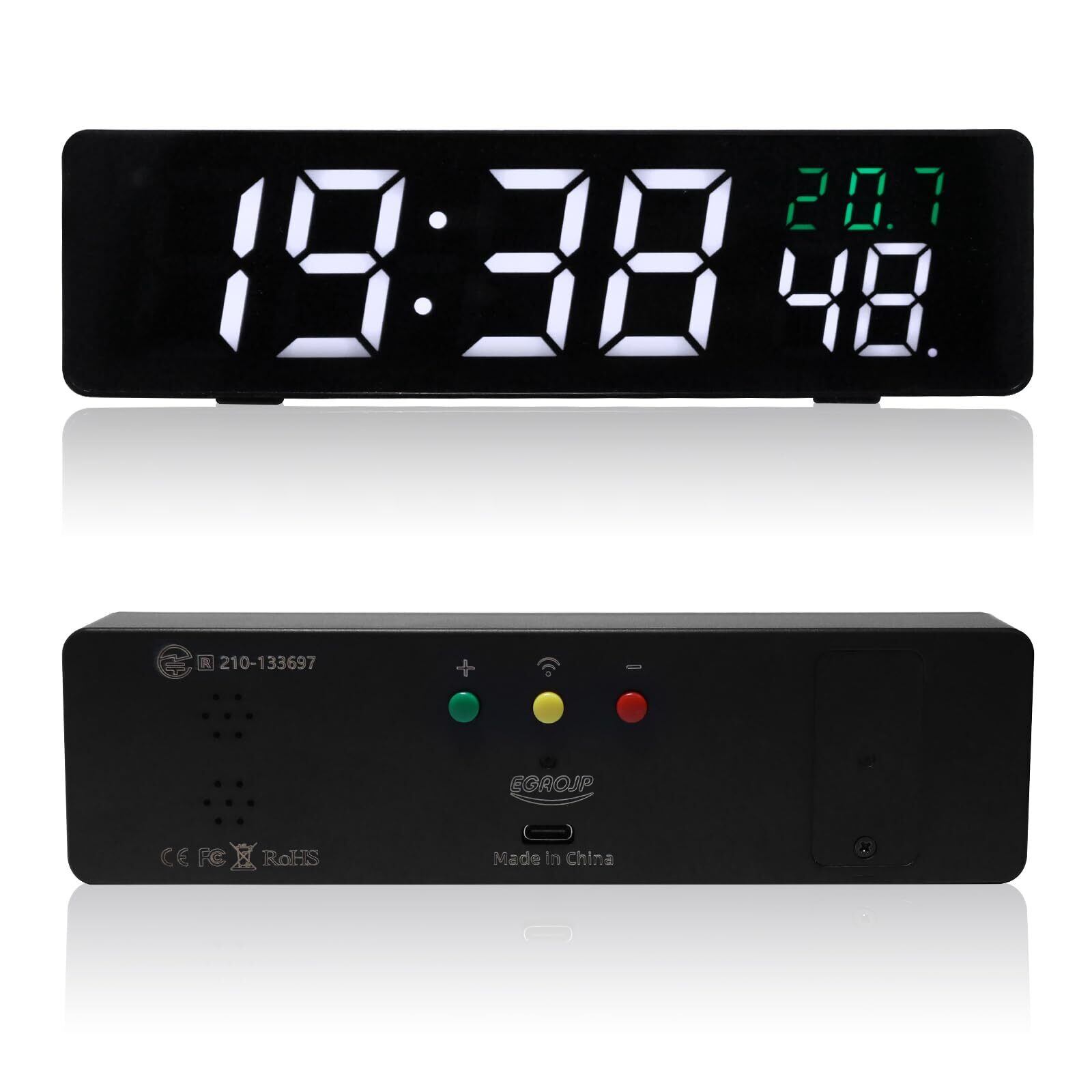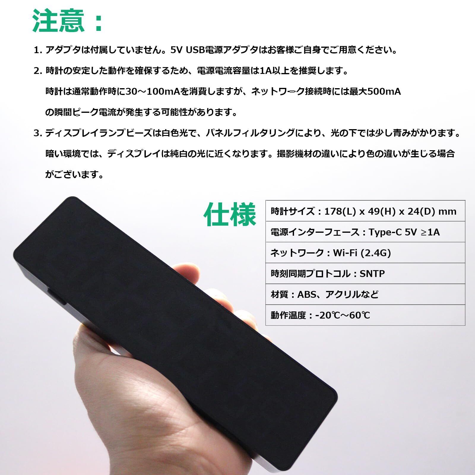 ⑤ 多機能&拡張性 内蔵温度センサーに加え、WiFi経由でリアルタイム天気情報(気温/湿度)を表示。USB Type-C給電(5V1A以上推奨)で、最大5時間のタイマー機能やOTAファームウェア更新に対応。ABS樹脂とアクリル製のコンパクトボディ(178×49×24mm)は-20℃~60℃の環境下で安定動作します。
