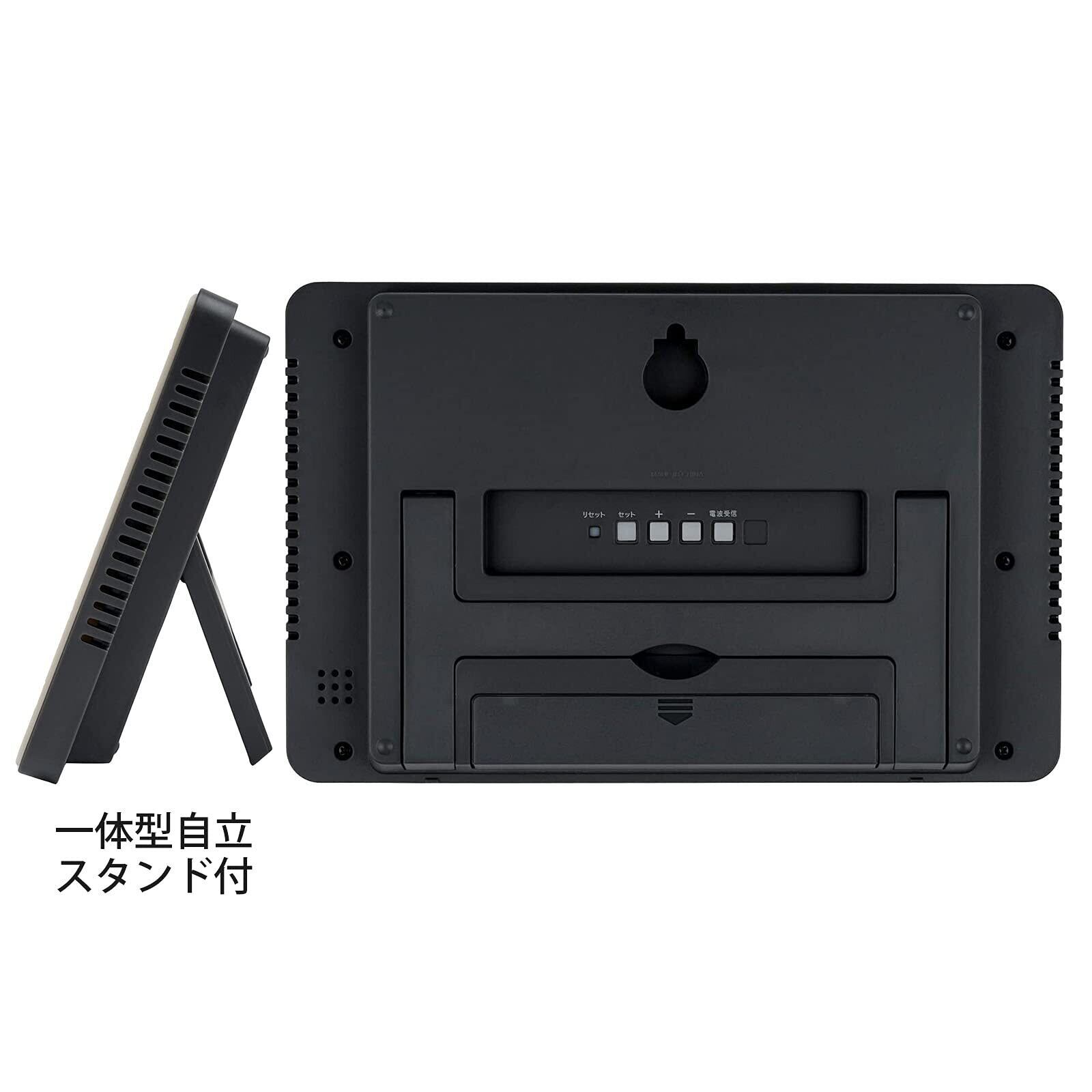 機能:電波受信機能(自動受信/手動受信)、電波受信ONOFF機能、温度表示、湿度表示、生活環境お知らせ機能(アイコン表示)、カレンダー表示、12/24時間制表示切替、置き掛け兼用