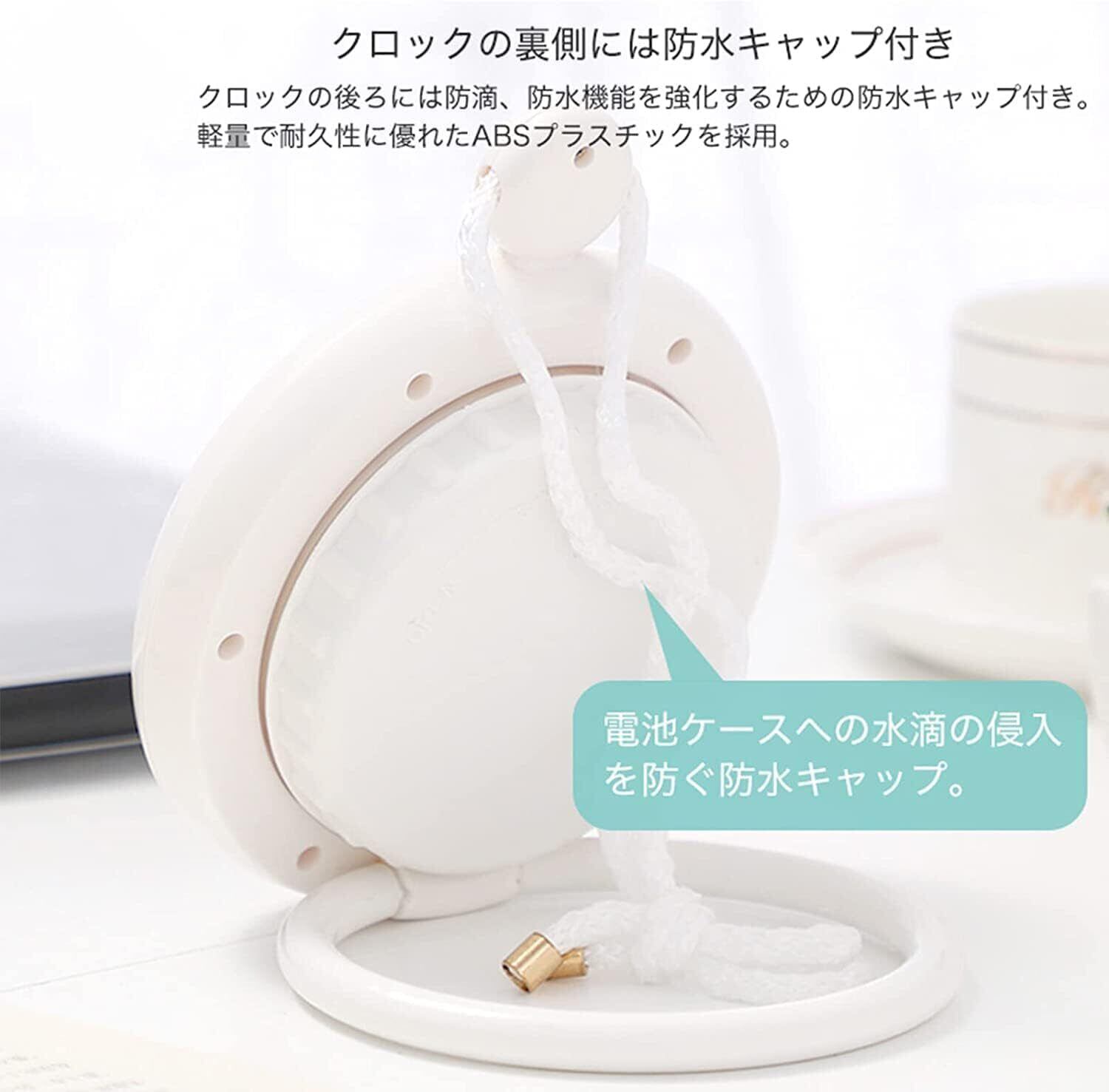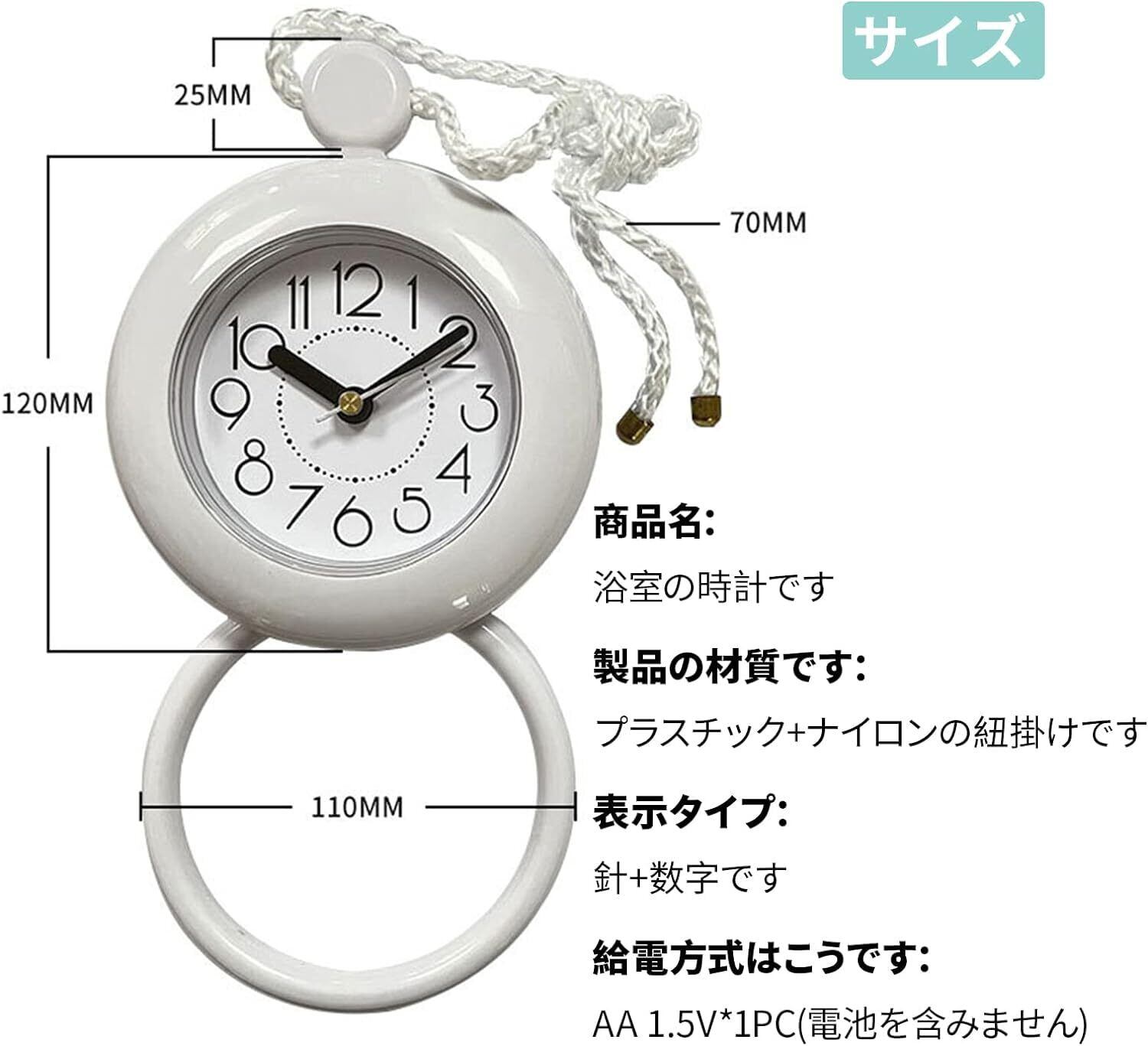 構造はシンプルで、電池ボックスにパッキン付きの蓋が有り水の侵入を防いで居ます。 洗面所の側面にぶら下げ、下の輪っかにタオルを掛けて使えます。 輪っかを折ってスタンドとして置き時計としても可能です。 水没や直接水が掛かる場所では向かない。 文字盤の大きさと表示文字の大きさが丁度よいです。 時計の直径は約12cm、文字盤の直径は約8cmです。 秒針はスイープ秒針で音が静かです。 長針、短針ともに黒で見やすいです。 電池ケースは単3電池1本で、防水も十分です。 壁掛け置き型両方オッケーです! 浴室の湿気にも対応の高機能。 時間を見ながら、お風呂にはいれますので、朝や外出時に大変便利です。 お出かけ前のシャワーを浴びていて、いつの間にか時間が経ってて焦ることが多かった人にお勧め。 電池の交換や時間のセットも簡単に出来て使いやすいです! 洗面所に置くことができる。見やすくスッキリした色合いが洗面所を明るくしてくれています。 シャワーヘッドホルダーにつるして使用することもできる。 見やすいし曇らない。 小型なので、お風呂の壁に両面テープでくっ付くこともできます。 お風呂に時計 お風呂場用、水に濡れても問題なく動いている。 浴槽に浸かった時に眼鏡を外していても、デジタルと違い、針のお陰で時間が分かる。 子供がいつまでもお風呂で遊んでて出ないので【何時まで!】と区切る。 子供の入浴中に、【いち、に、さん】と数字の勉強や時計の見方、あと何分で 出る!