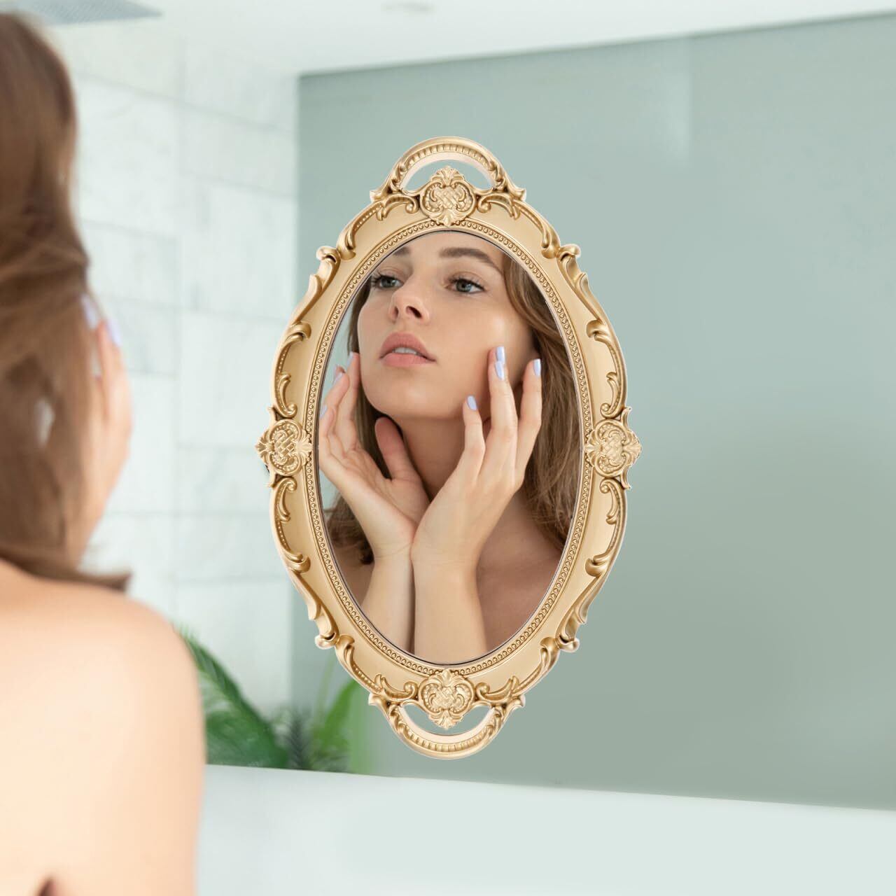 【レトロなデザインで雰囲気アップ】この化粧鏡はレトロな楕円形デザインを採用しており、フランスの宮殿エンボス加工が施されています。おしゃれなインテリアを求める方には、視覚的な焦点となり、室内の雰囲気を一気にアップグレードします。