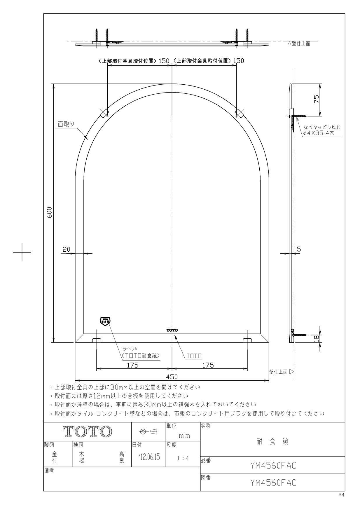 TOTO 耐食鏡 アーチ形面取り YM4560FAC