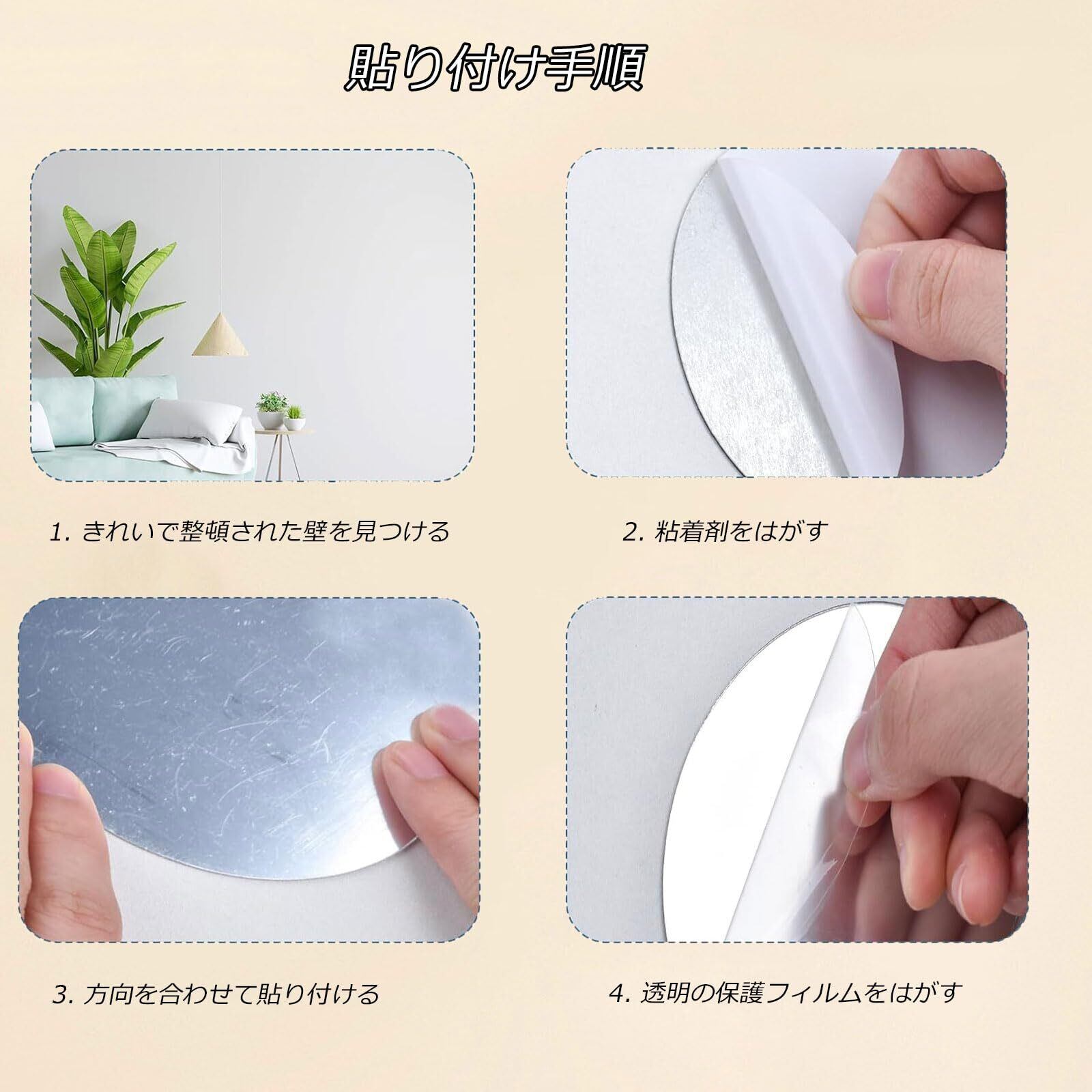 【注意】ミラーウォールデコレーションステッカーには傷を防ぐための保護フィルムが付いています。表面の保護フィルムを剥がすと、アクリルウォールステッカーはより光沢が増します。貼り付け完了後、表面の保護フィルムを剥がすことができます。気に入らない場合は、壁を傷つけずにウォールステッカーを簡単に剥がすことができます。