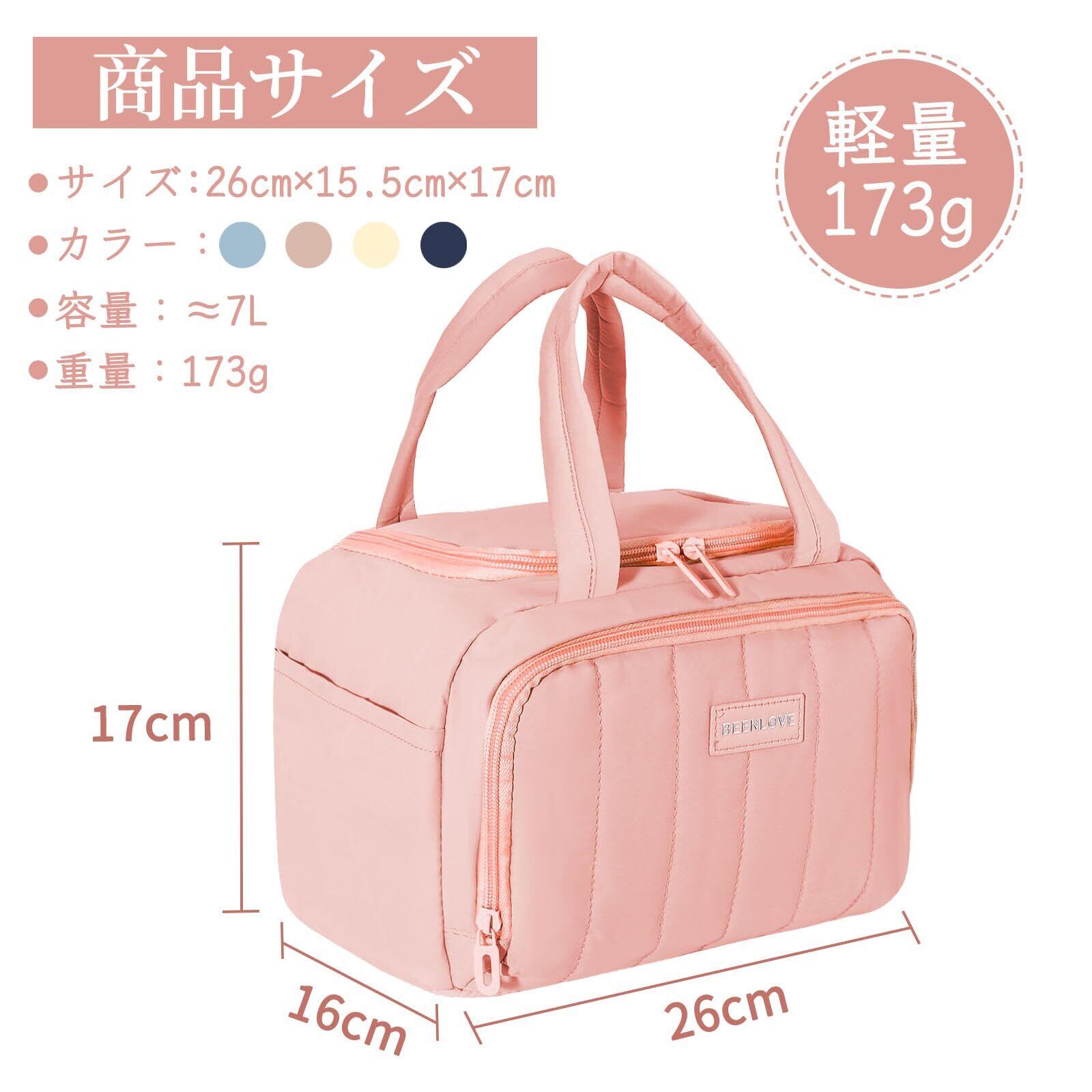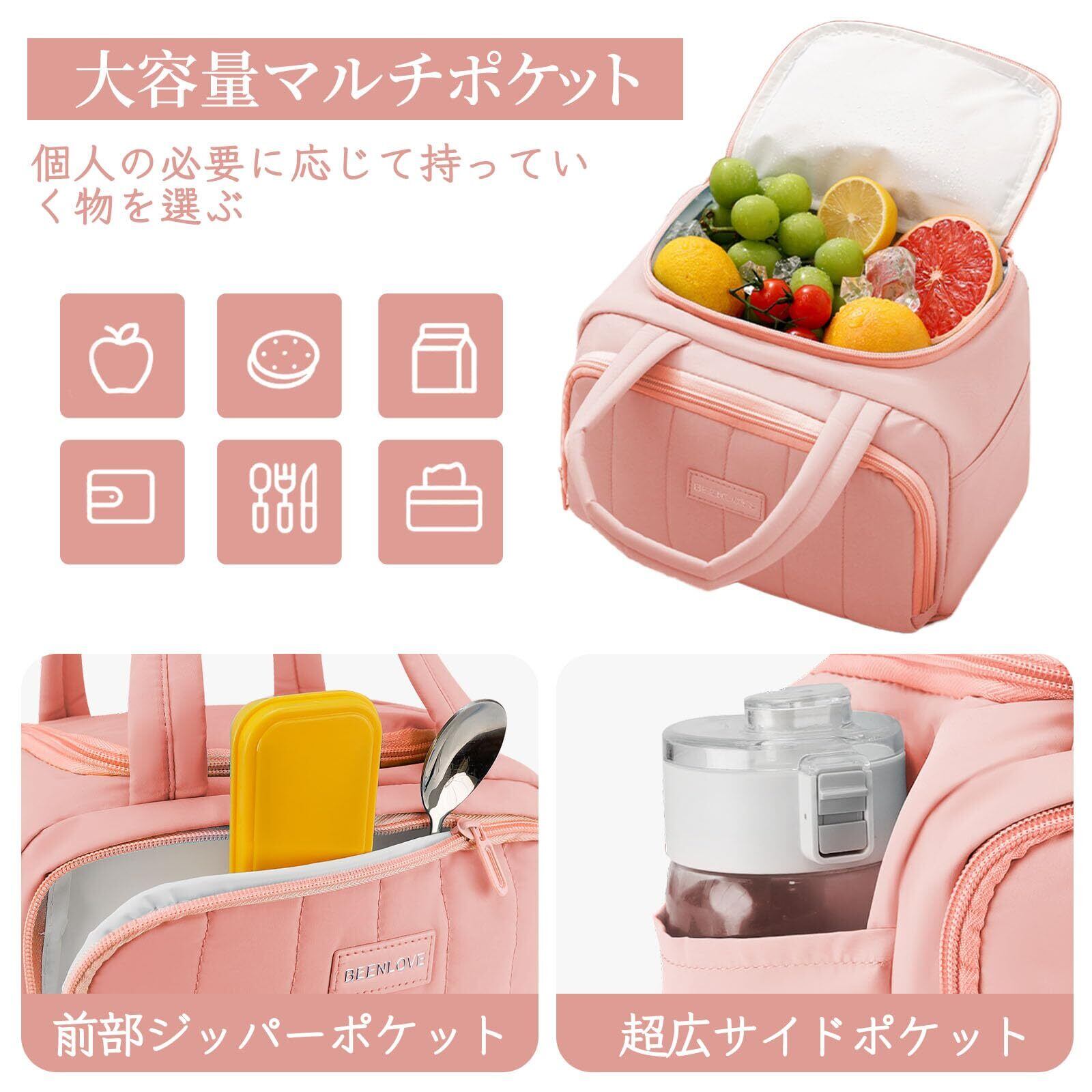【毎日使える大容量バッグ】ランチトートバッグは、26×16×17cm のサイズと約 7 リットルの容量を持つデザインとなっています。メインコンパートメントには、食品容器、果物、スナックが収容されています。フロントのジッパーポケットはカトラリーやハンカチなどを収納できる大きさです。2つのサイドポケット付きで水筒や折りたたみ傘などを入れることができます。