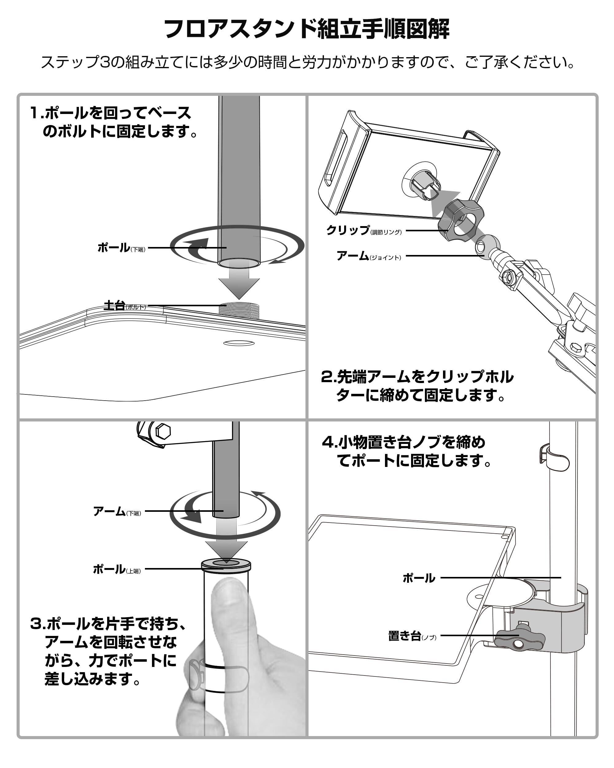 【伸縮式・組立簡単】工具不要で、片手でポールを持ちながら回転操作でアームを差し込むだけの簡単組立(全4ステップ)です。伸縮ポールは45〜80cmで調整可能、アーム角度を変えることで最大140cmまで設定できます。立位・座位・横になった姿勢でも両手を開放し、テレビ鑑賞、娯楽、仕事、学習などに幅広く活躍します。