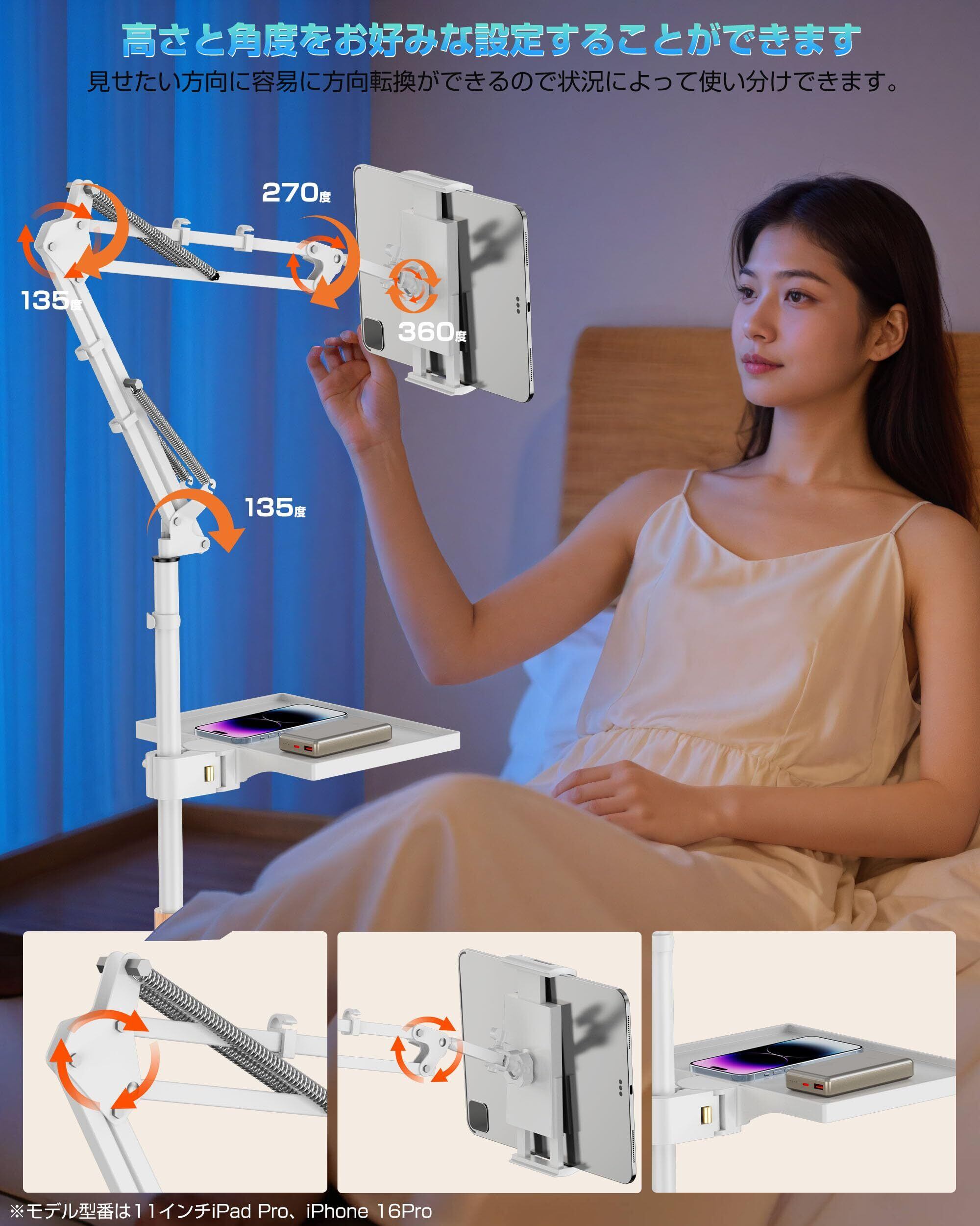 タブレット スタンド 床置き 伸縮式 iPadアーム 寝ながら 4.7-17.3インチ対応 45-140CM高さ調整 2.0KG耐荷重 小物置台付き 土台強化 360度回転 スマホ/タブレット/モバイルモニタ対応 ホワイト