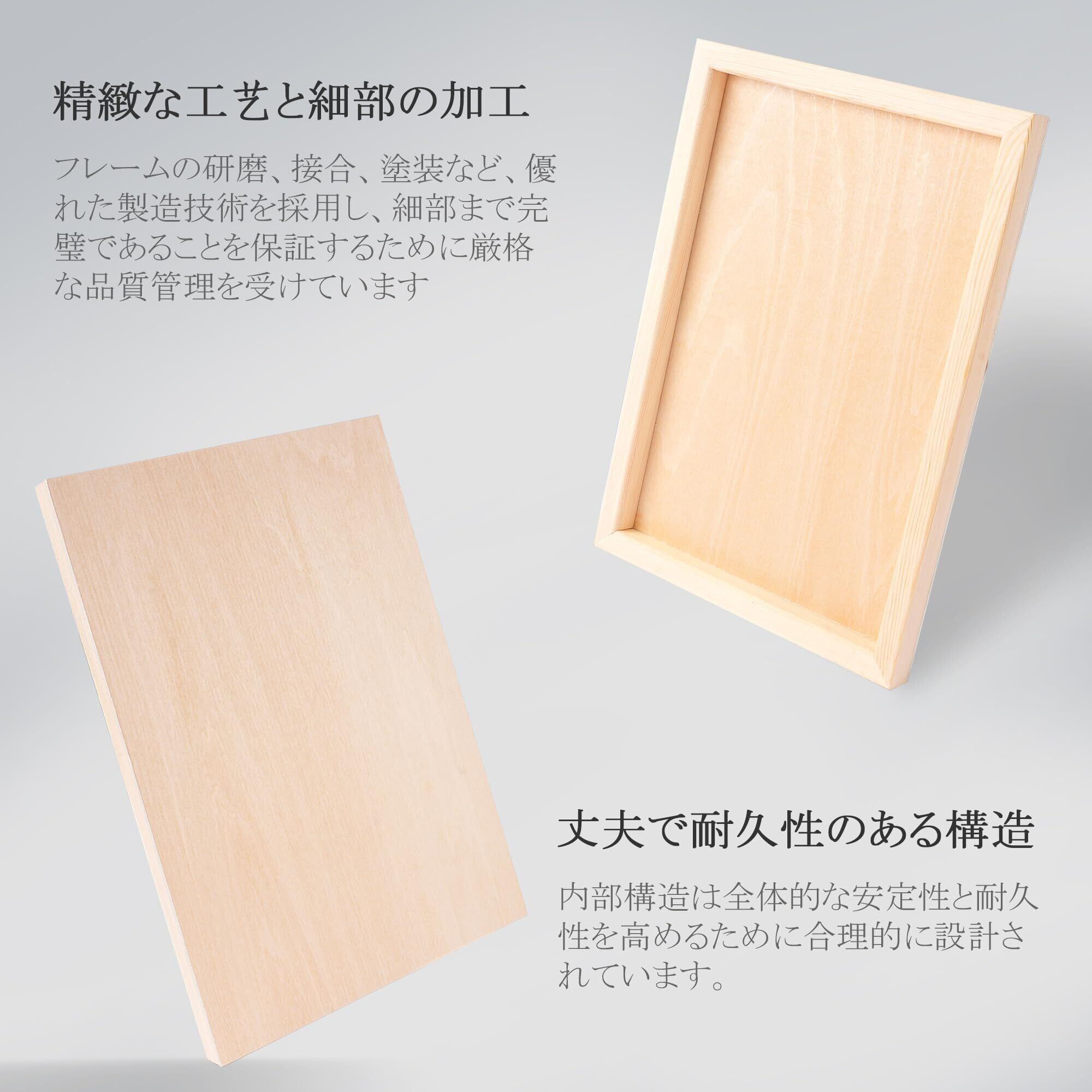 100%松木フレーム - 1/8インチの厚さの樺木ボードが5/8インチの深さの松木フレームに結合されているため、非常に頑丈で、釘はいらないです。100%松木フレームは耐久性があり、しっかりとした支持力を提供します。このシナベニヤパネルは、箱から出してすぐにペイントできる状態でお届けします。