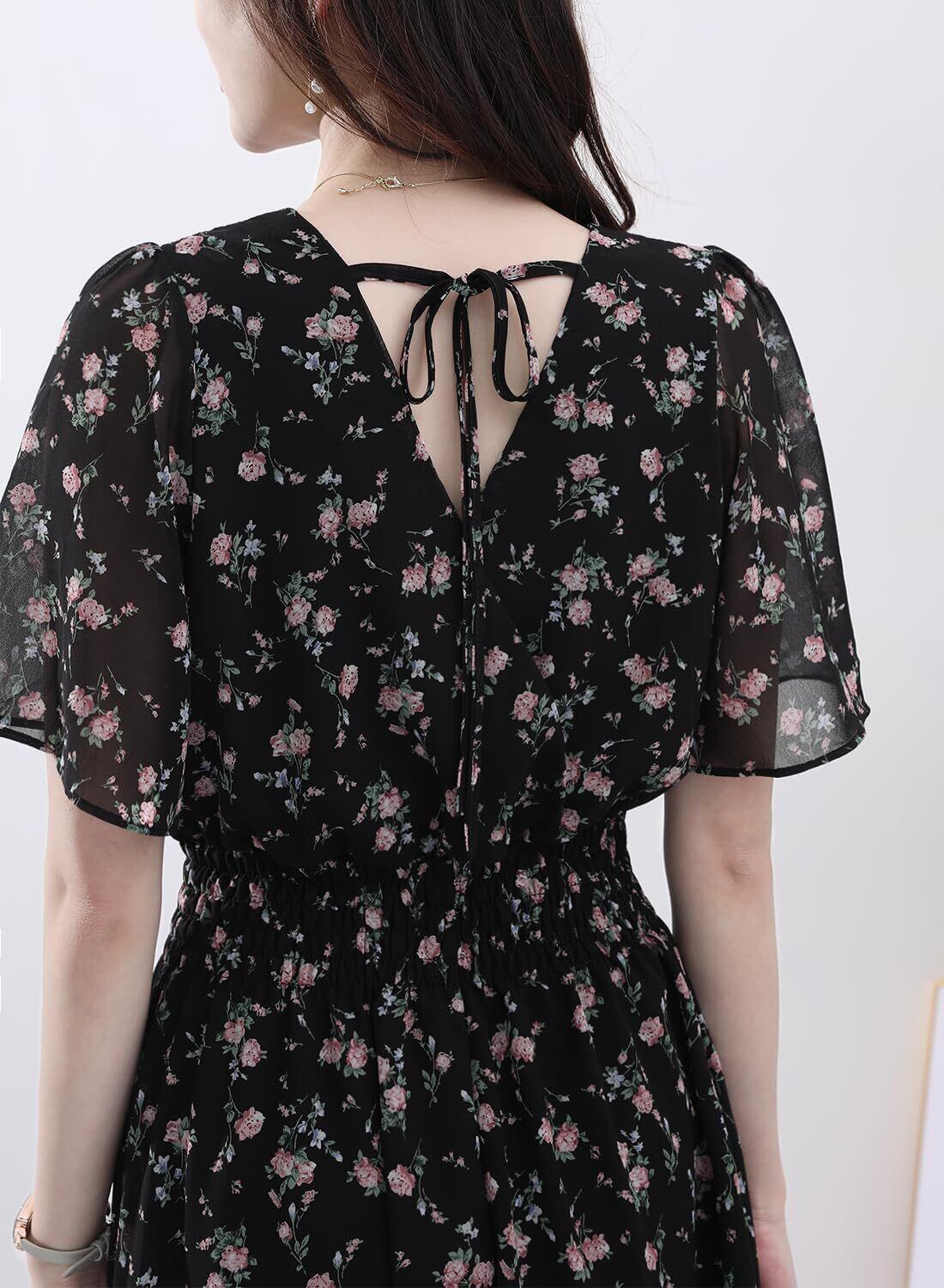 本商品のブラックカラーは花柄の異なる2バリエーションがございます。ご注文前に必ず商品詳細画像にてご確認くださいますようお願いいたします。全体に散りばめられた花柄とシックなカラーの組み合わせ、可愛い雰囲気に溢れていて、1枚で主役級の半袖のワンピースが新登場しました。胸元と背中はVネックのデザインで小顔効果だけでなく、女性らしい鎖骨の美しさを際立たせ、ほっそり見せてくれます。華やかなやや透け感のあるフレア袖で気になる二の腕をカバーでき、絶妙な女性らしさを表現したレディースのロングワンピースです。ご注意:バックバンドを自由に調整することで胸元と背中の開き方を変えられますので、お気になる方はご了承ください。