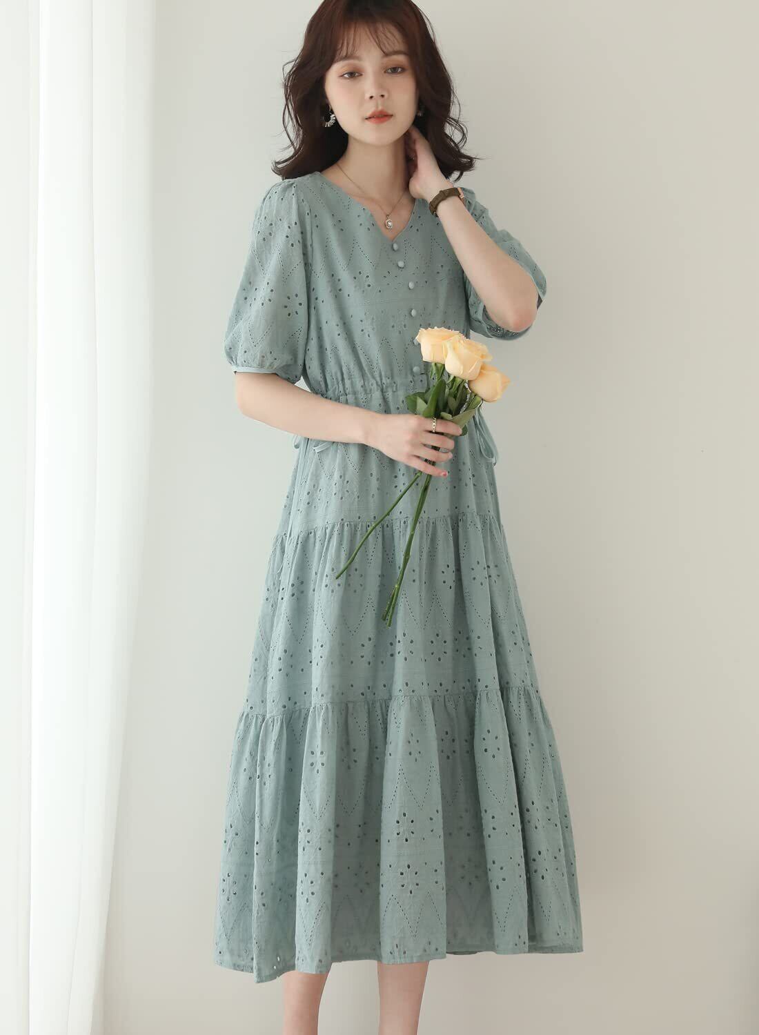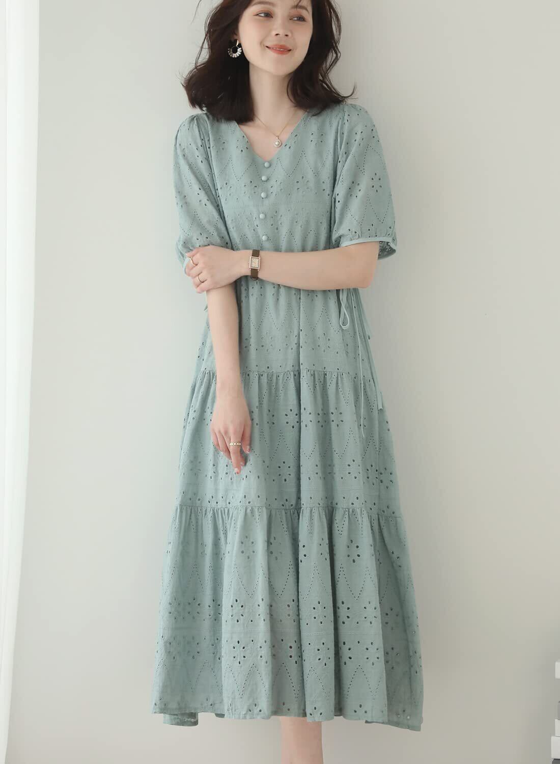 ●刺繍花レースが全身に展開されて、程よい甘めのフリルデザイン、コットン素材ならではのふんわり素材、ナチュラルフェミニンな雰囲気にしたいときの、おすすめ夏ワンピが今季に新登場しました! ハイウエストの両サイドにリボン付きで、ウエストサイズを調整できる同時に、スタイルが美しい印象も引き出します。歩く度にふわっと揺れ動く裾周りも涼し気で、シーズン感を高めてくれます。優しげな色調で女性らしいイメージを演出してくれるドレスです。