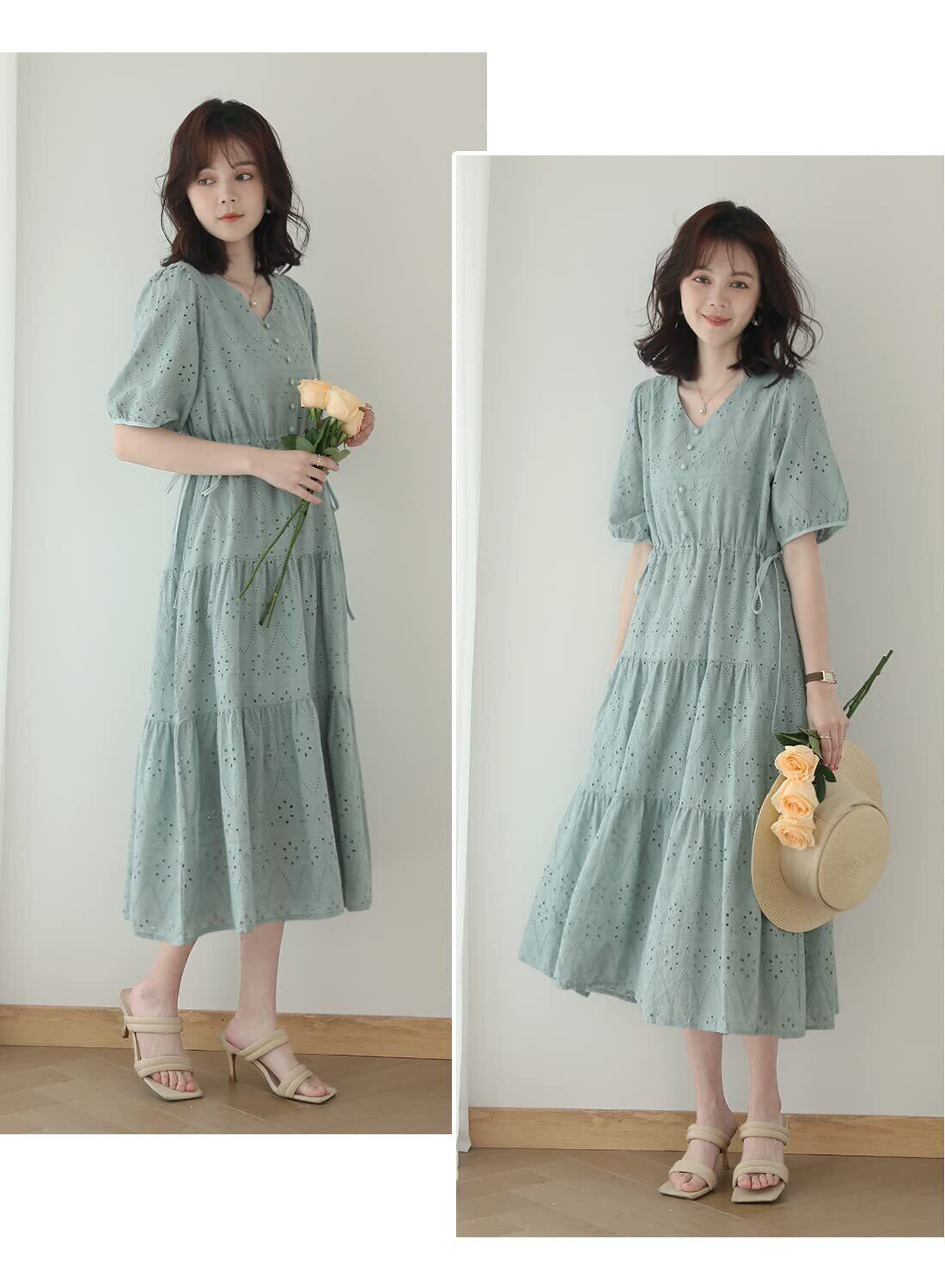 [Sueeya] スイーヤ ワンピース レディース ロング 刺繍 レース 半袖 フリル パフスリーブ ハイウエスト リボン 着痩せ 体型カバー おしゃれ Vネック 裏地付き 女子会 デート お出かけ 夏