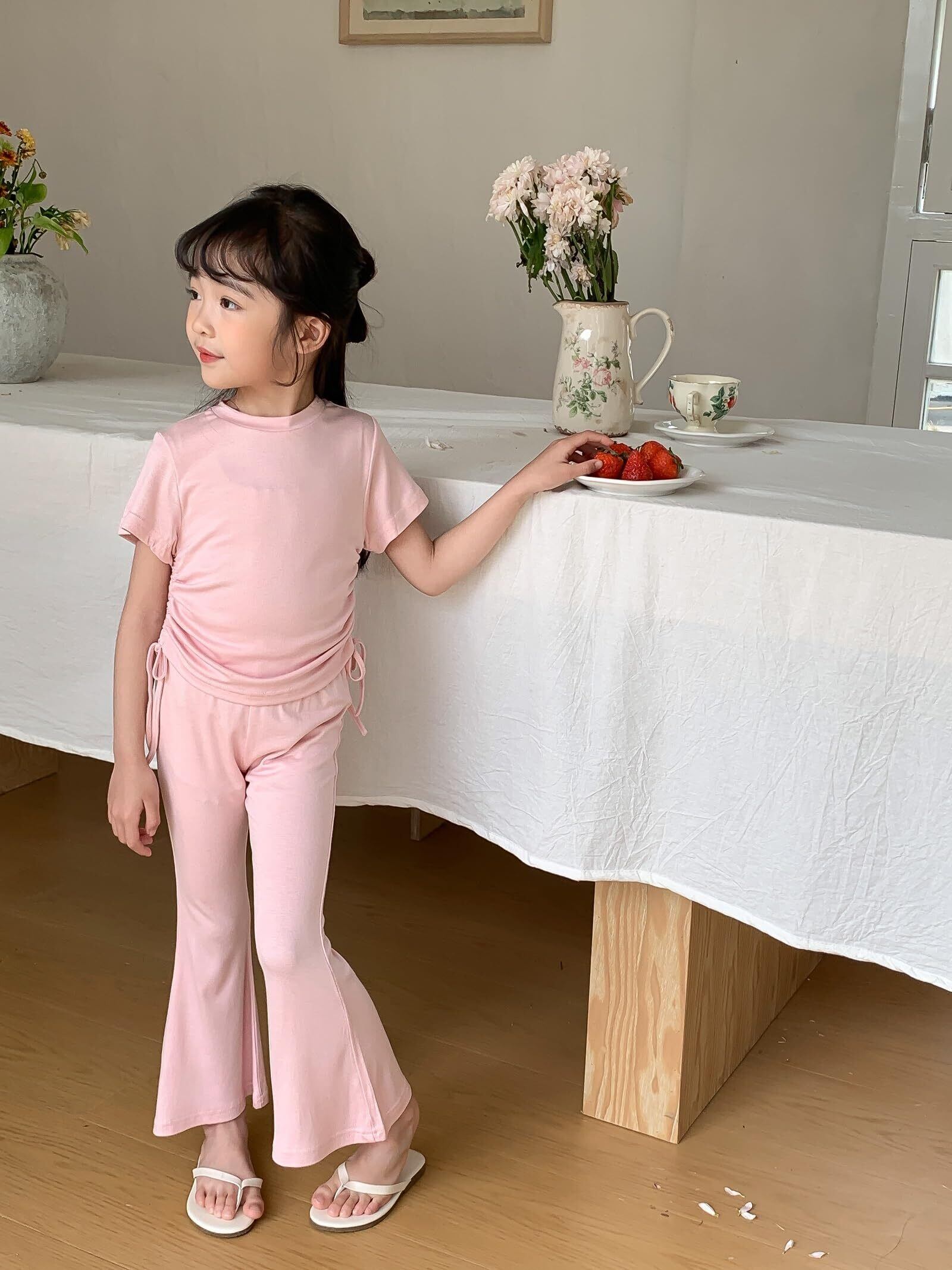 【デザイン】シンプルで無地な女の子セットアップです。トップスはサイドシャーリングがアクセントに!裾に向かって広がるフレアパンツがオシャレです。