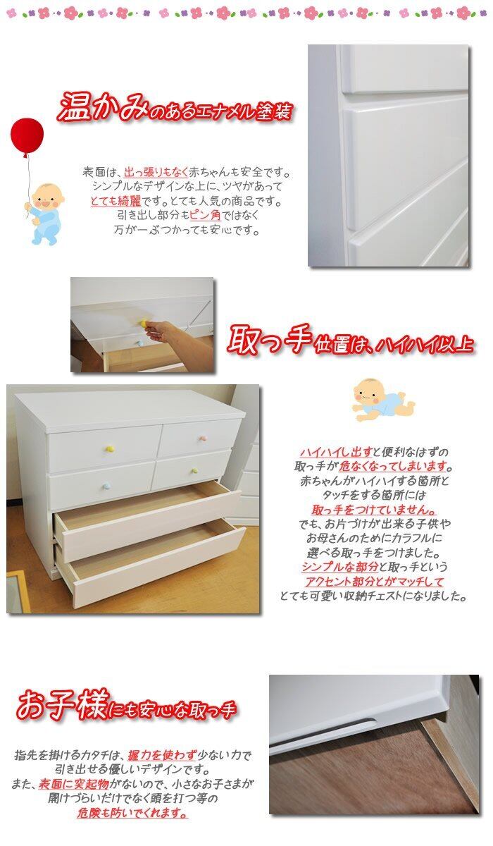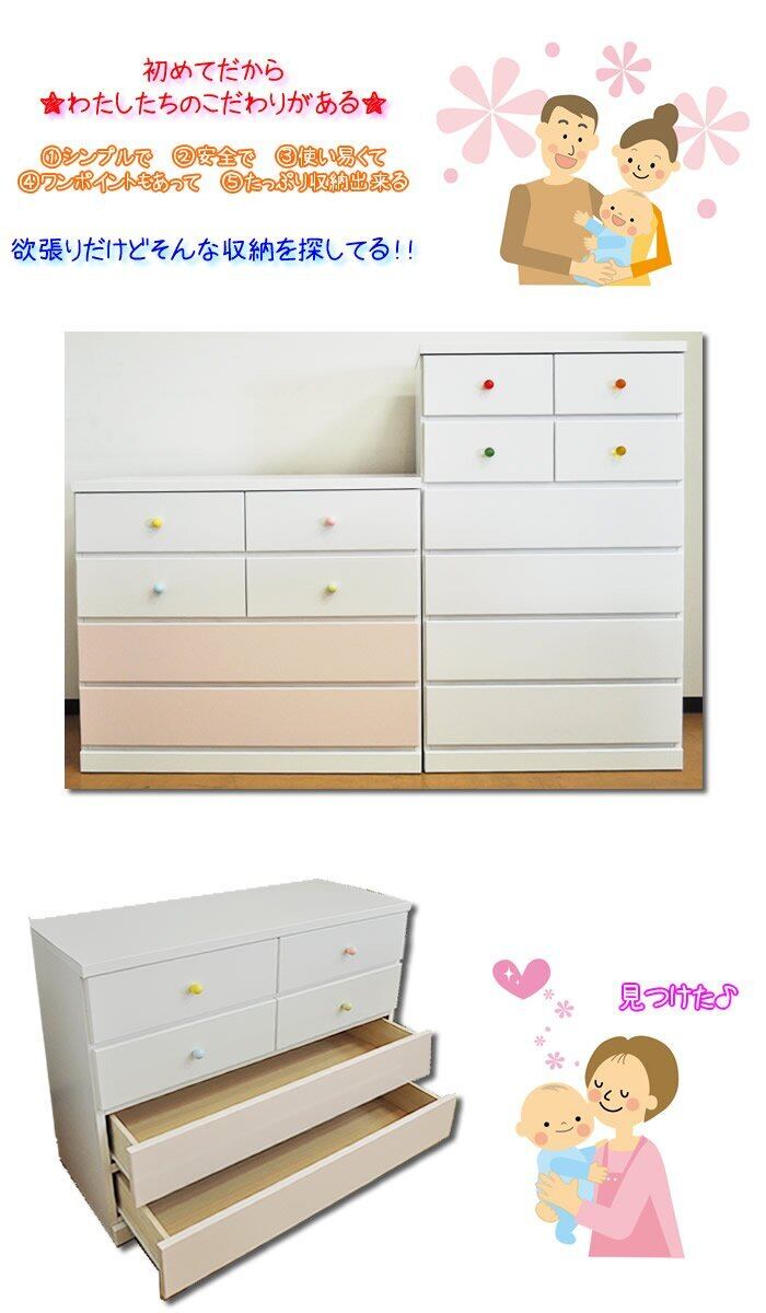 取っ手がワンポイントになったベビータンスにイチオシのシンプルで使いやすいカラフルチェストです。抜群の収納に加え、洋服が見つけやすいように引出しは全段、スライドレールです。使いやすいサイズ100cmロータイプです。ベビータンスは、全て家具産地大川市の家具職人が一本一本丁寧に産する国産です。だから、安心・安全・高強度です。自分使いのご購入以外にもおじいちゃんおばあちゃんからの出産祝い・お友達からの新築祝いなどにも人気の商品です。