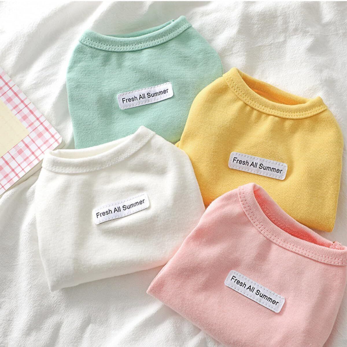 【4色展開】首周りや袖口、裾にはパイピングを施しました。定番カラーのイエロー・グリーン・ホワイト・ピンクをプラスした4色展開で、男の子、女の子問わず着用できます。多頭飼いの方は色違いやお揃いにして楽しめます。