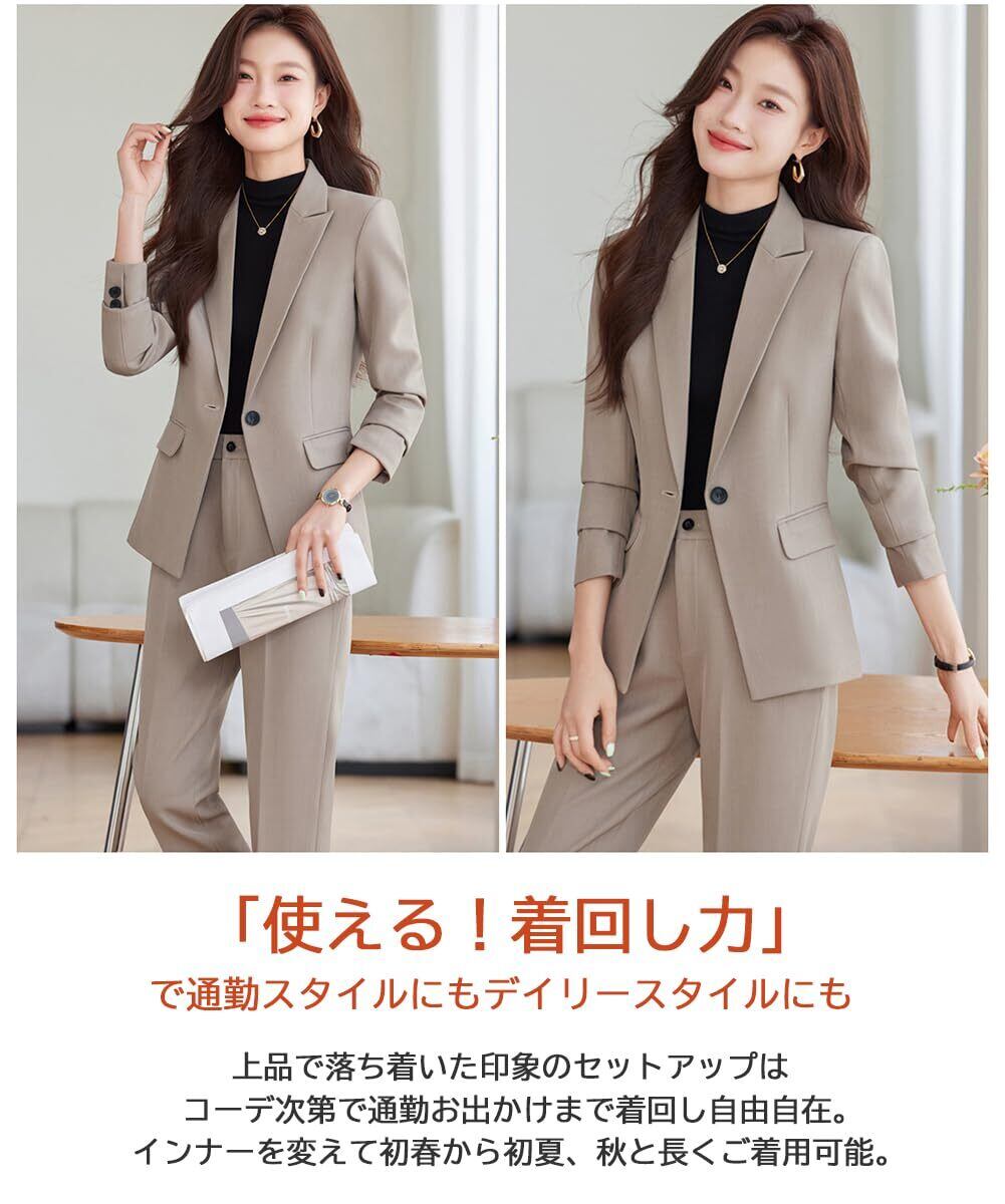 セット内容:ジャケット・パンツの2点セット。セットアップなのでスタイリングも迷わずこれ一つで便利なパンツスーツです。ジャケット・ボトムはそれぞれ単品使いで毎日の通勤アイテムとして重宝。