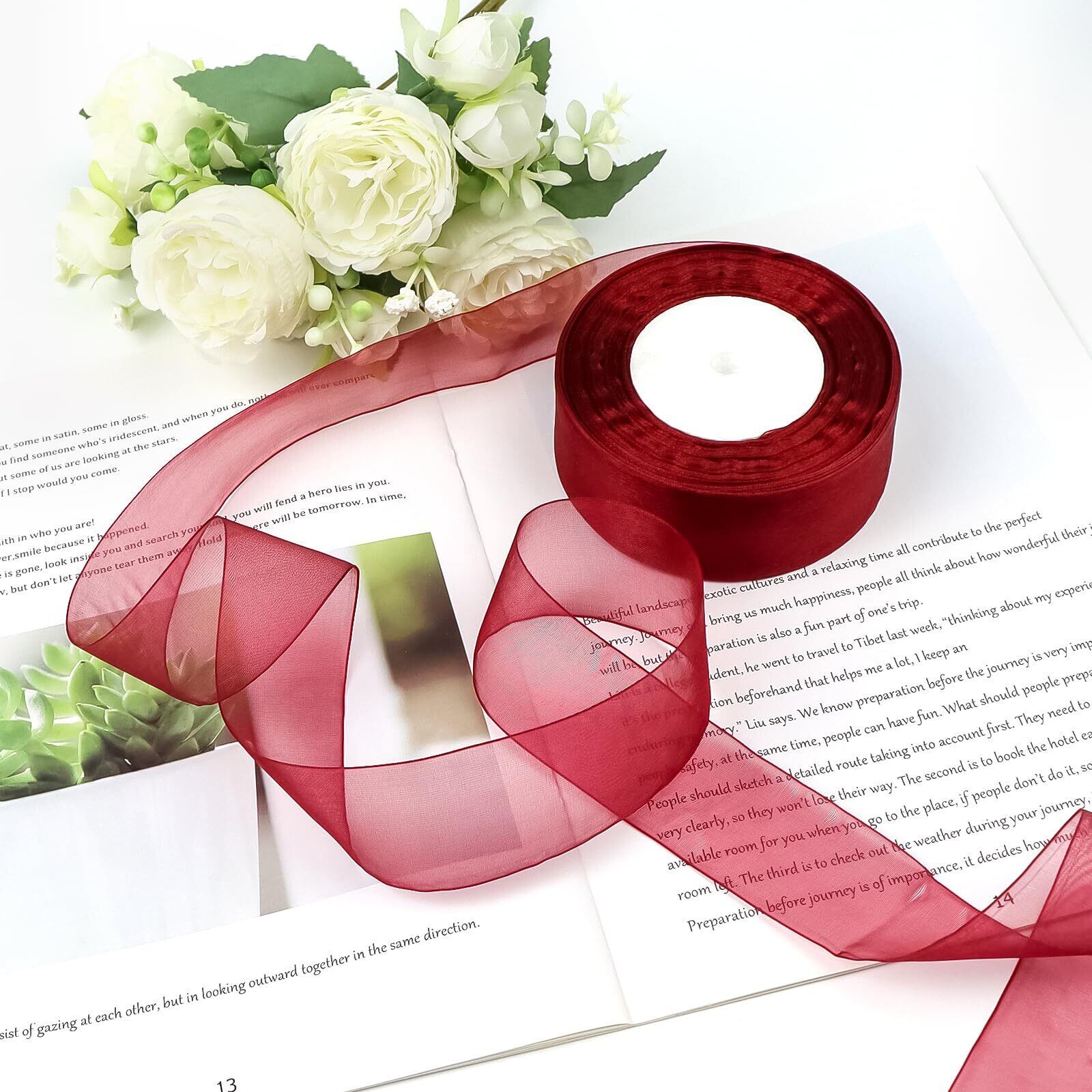 【リボンの仕様】色:えんじ色;サイズ:幅4cm x 45m/1巻;材質:ポリエステル。リボンはポリエステルでできており、表面は滑らかで光沢があり、高級感があります。フチ処理もきちんとしてあって、作業中にほつれたりしません。