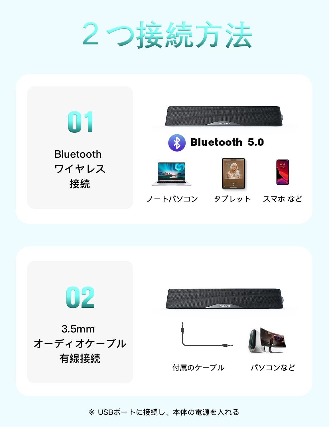 【2つの接続方法】 Nylavee PCスピーカーには、Bluetooth と3.5mmオーディオケーブルの2つ接続方法があります。ノートパソコン、デスクトップ、PC、携帯電話、タブレット、PS4など幅広いデバイスと互換性があります。