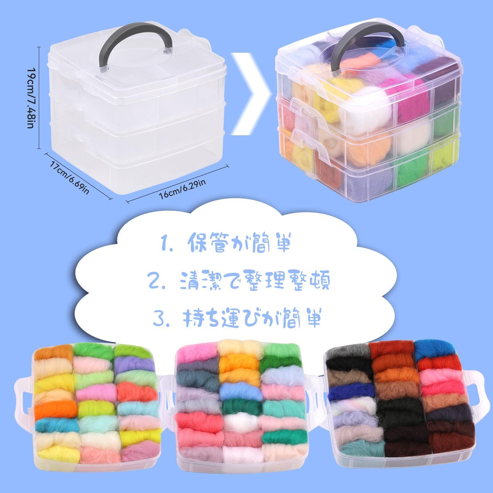 きちんとした梱包: クリアビューの 3 層梱包箱を使用すると、ウールのすべての色を一目で確認でき、整理整頓して簡単にアクセスできるようになります。 しっかりと梱包されているので、どこにでも持ち運べます。