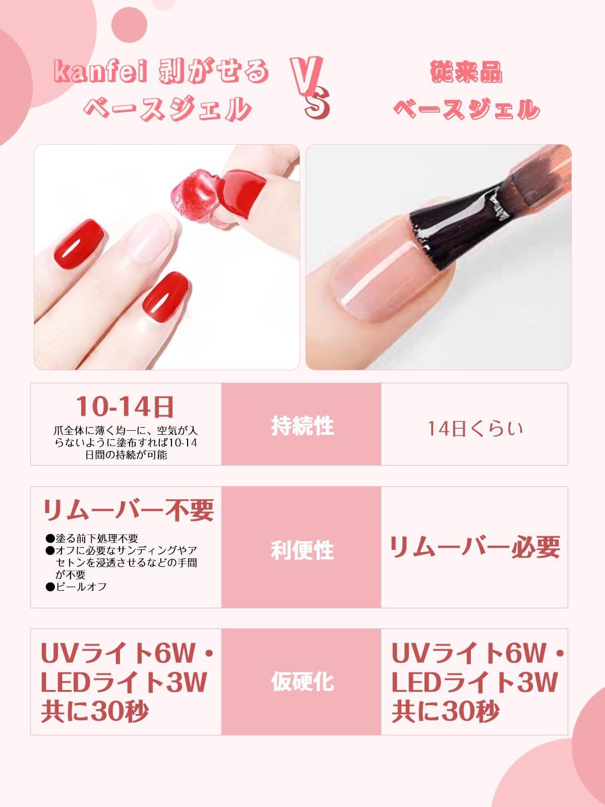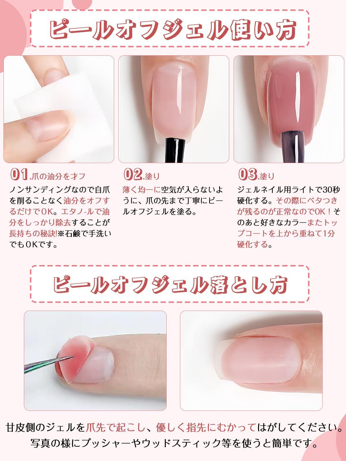 ①口に入れないでください。➁ベースジェルを使う際に、特に初心者の方には「ベースジェルがベタベタしている」という現象が驚きかもしれませんが、実はこれ通常のことで、不良品ではありません。③ベースジェルがベタベタした後、次に塗るジェル(カラーやトップジェル)を塗ることで、そのベタつきは解消されます。トップジェルを塗って硬化させれば、滑らかな仕上がりになります。そのあと、剥がせます。