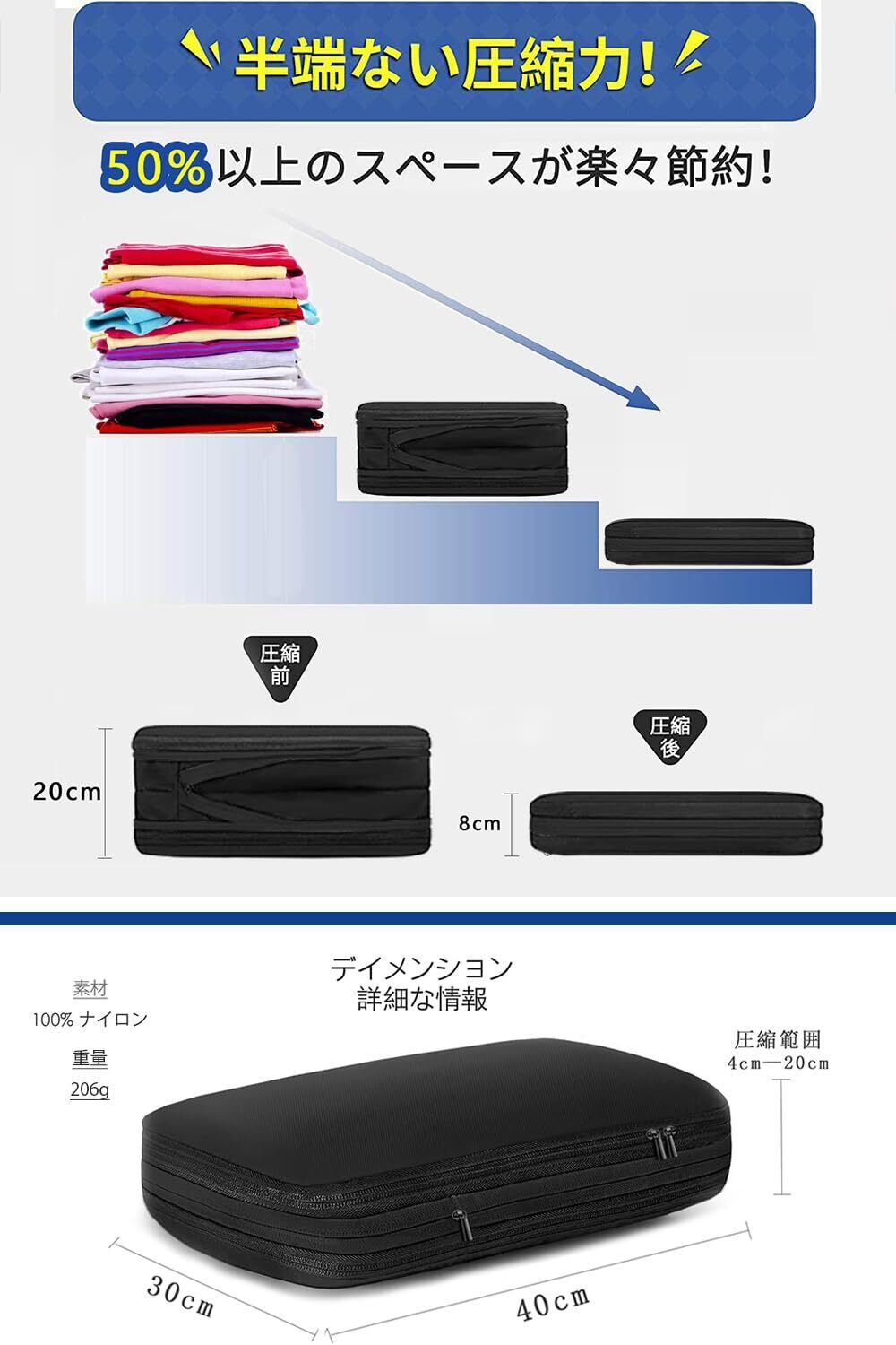 【ファスナーで簡単圧縮】 通常の圧縮袋とちがって、圧縮用の吸引機などがいらないため、その機能というのが、ファスナーにを閉めるだけでOKの超カンタン圧縮機能!見た感じは小さい圧縮バッグですが、実際は多くの衣類が入ります。旅行、出張やホテル泊などに最適な収納バッグです。【】何か問題がございましたら、お気軽にメールよりご連絡ください、の営業担当は至急に対応いたします。
