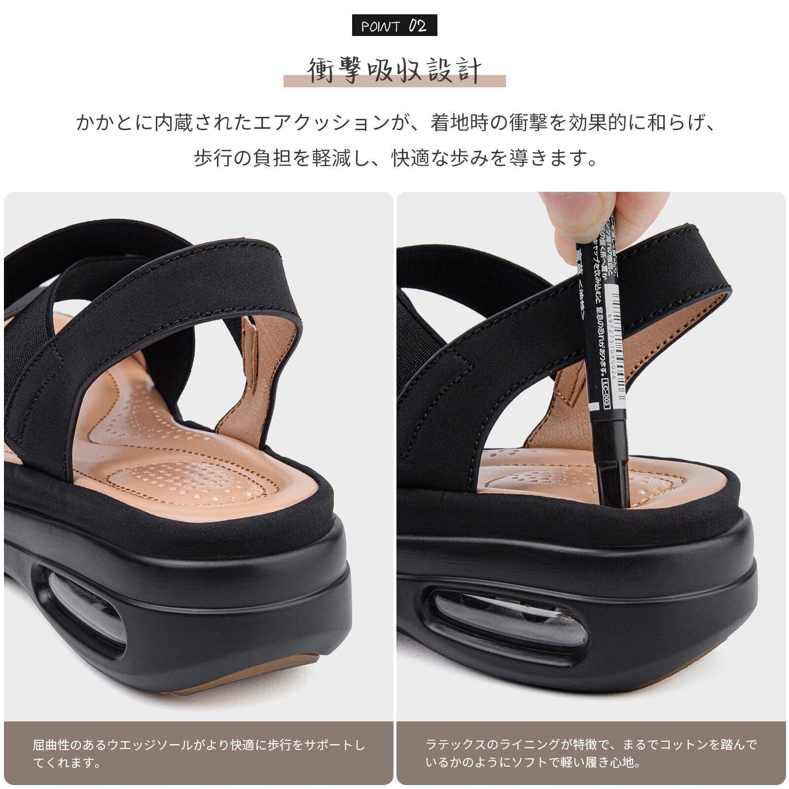 【衝撃吸収設計】かかとに内蔵されたエアクッションが、着地時の衝撃を効果的に和らげ、歩行の負担を軽減し、快適な歩みを導きます。ラテックス製のライナーを備えたこのスポーツサンダルを履けば、コットンを踏んでいるようにソフトで軽い履き心地が味わえる。