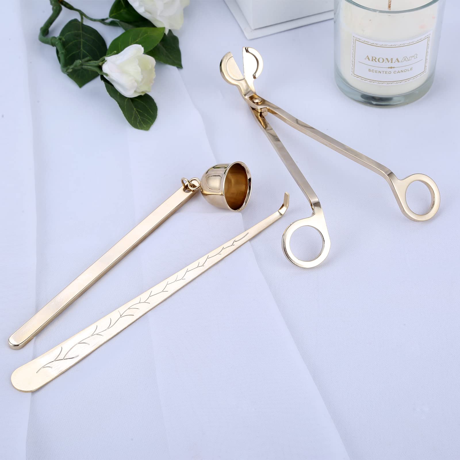 【便利&安全】芯切りばさみは平行に芯まで伸ばしてカットでき、普通のはさみより便利です。ローソクの炎を覆って、酸素との接触をカットすることで炎を消すろうそく消し鈴は煙の悩みをなくさせます。フックは芯を解けたロウソク液に押して炎を消し、芯の位置を調整できます。ローソク消しツールは柄がたっぷり長くてホットワックスなどによる傷害からよく守れます。