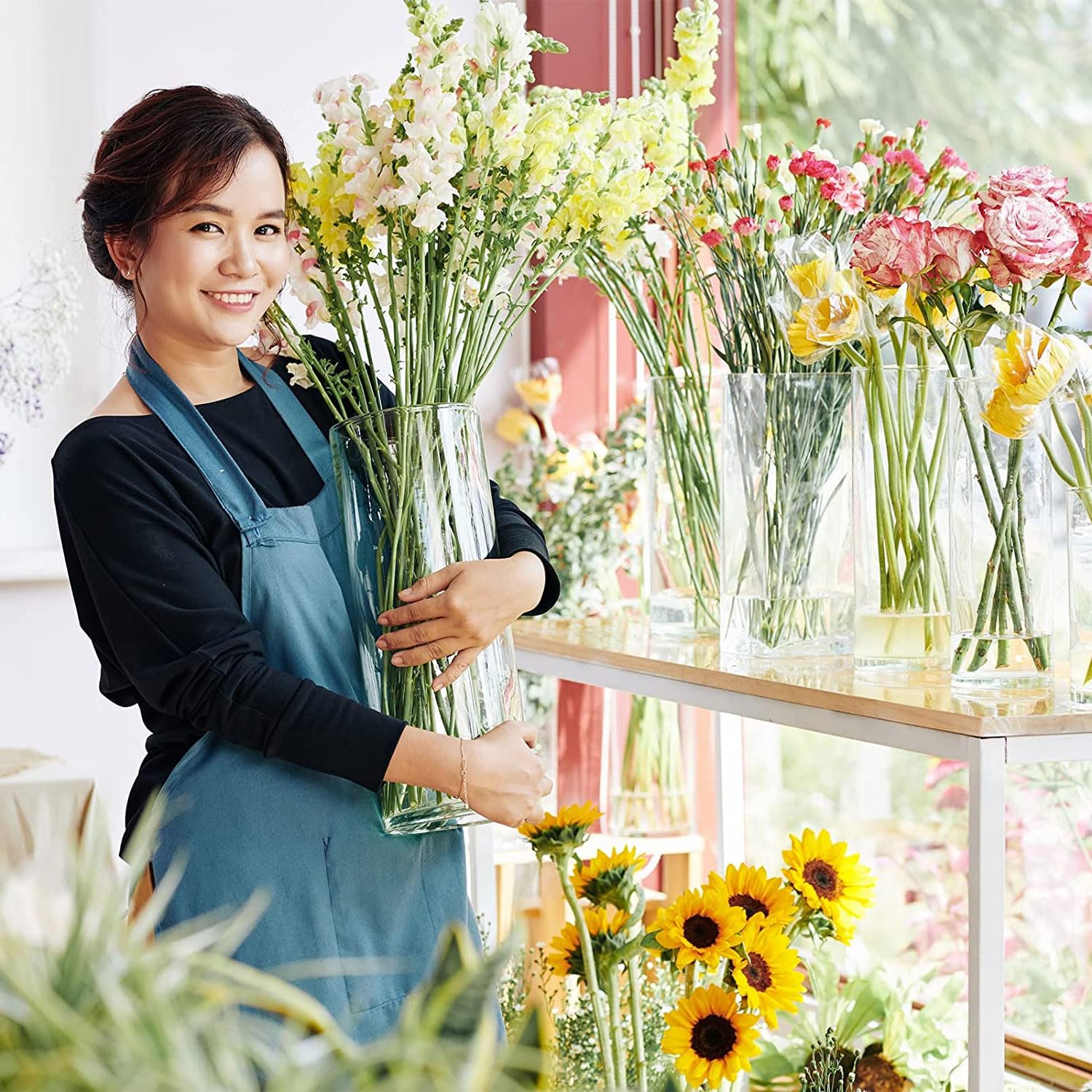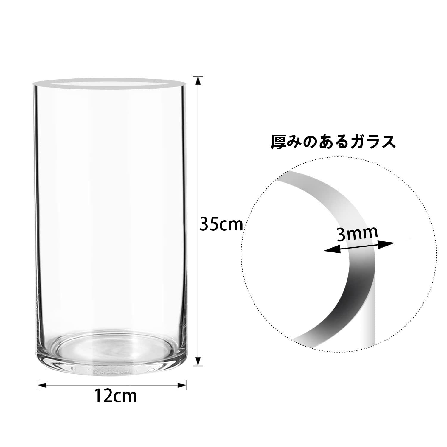 大きいサイズ: 高さ:35cm 直径:12cm このサイズのシリンダーベースは、60〜80cmのブーケ、つる性の花、茎、葉、枝に適しています。例えば、桜、バラ、ユリなどは花瓶にちょうど収まる長さです。