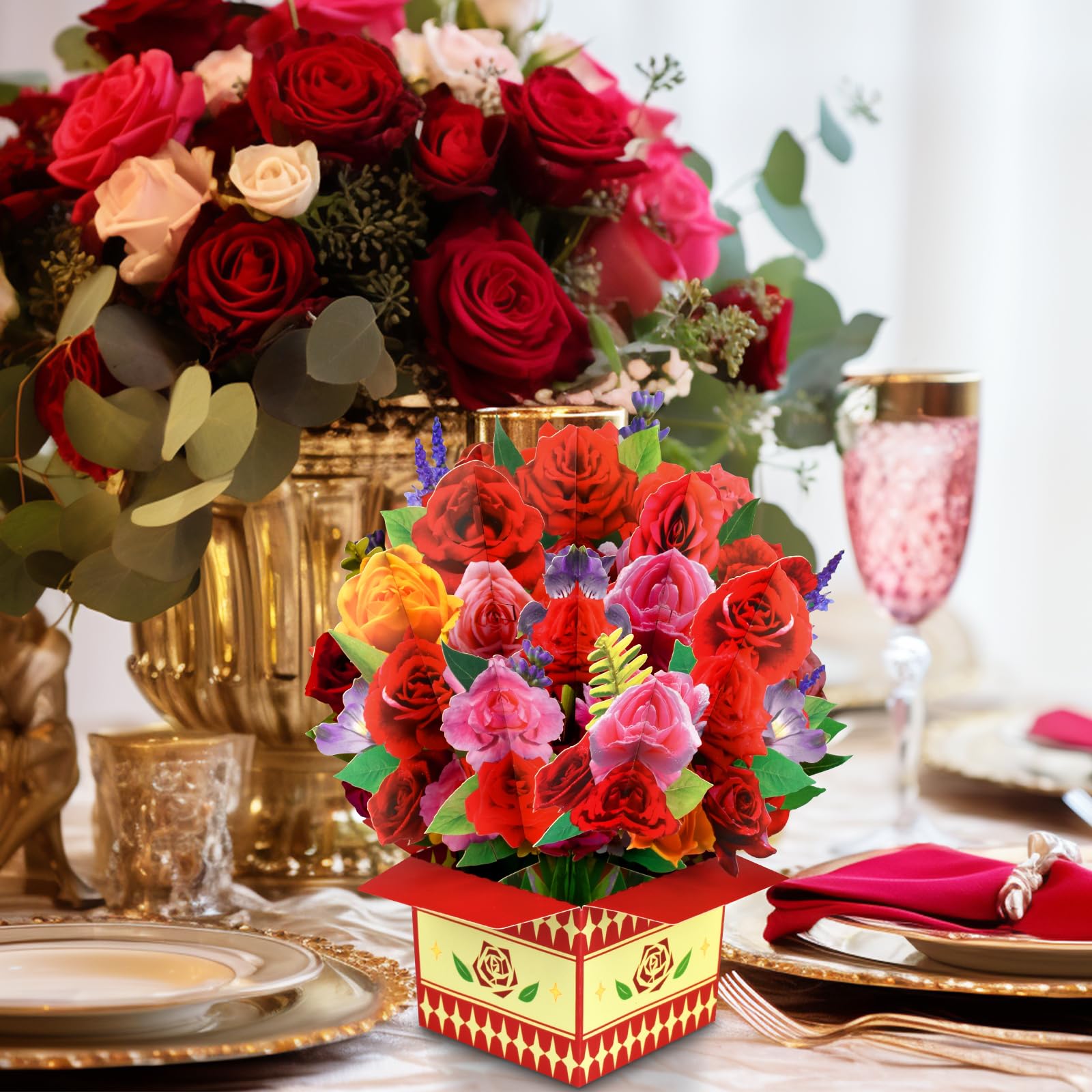 3Dポップアップデザイン:カードを開くと、四角い箱にアレンジされた美しいリアルなバラのブーケが現れ、印象的なディスプレイを作り出します。