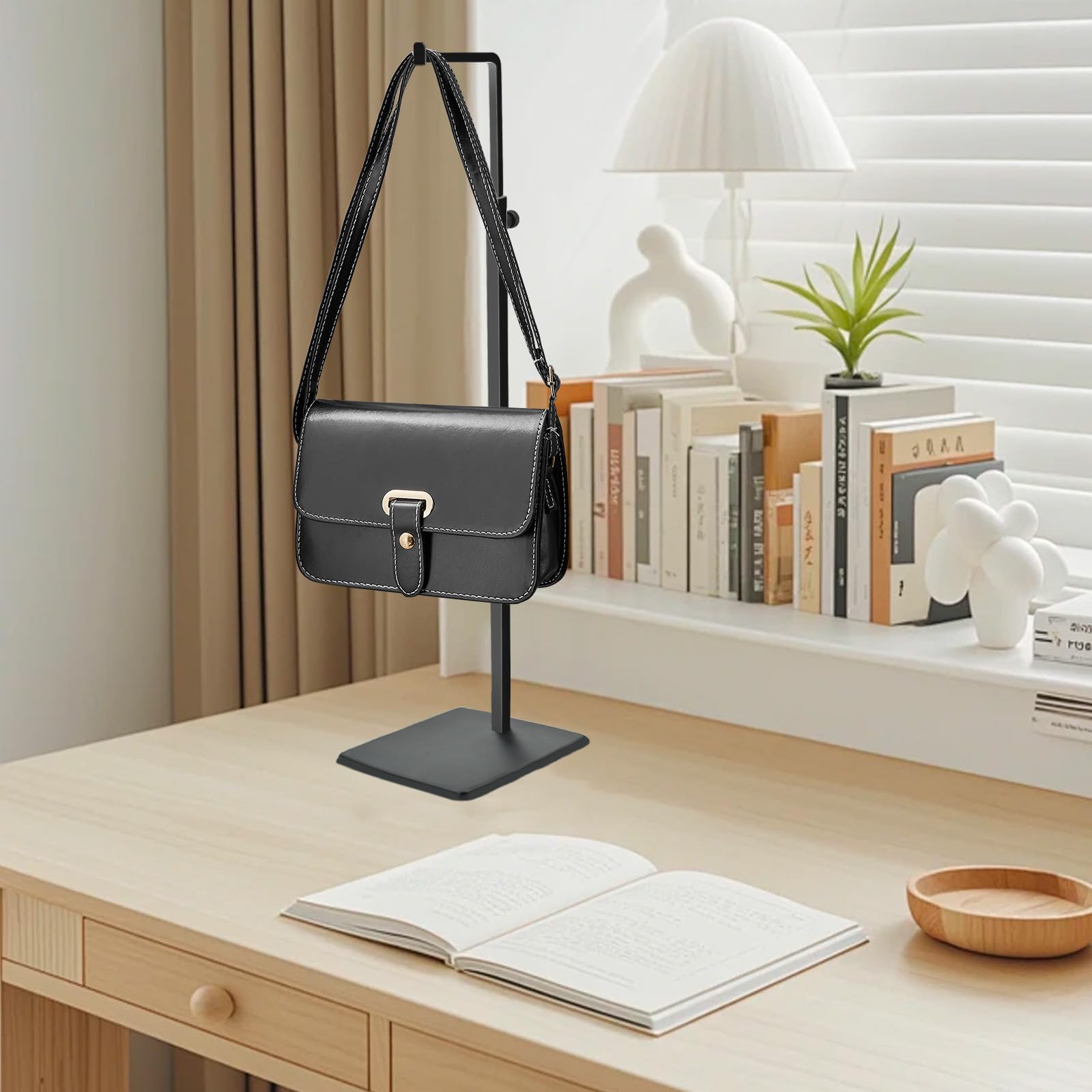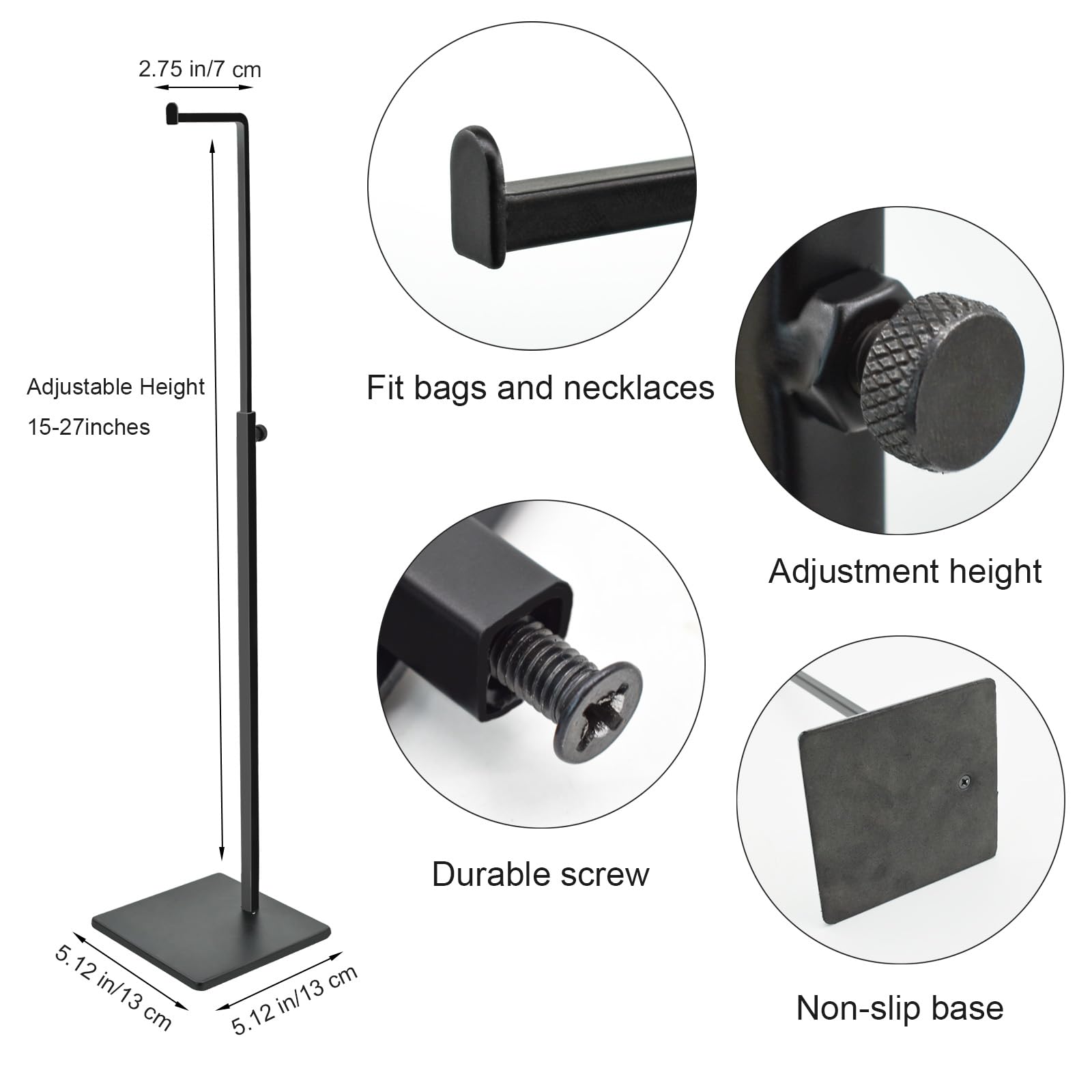 高さ調整可能:黒いバッグスタンドの高さは伸縮可能で、ネジで調節することで、自由に昇降でき、高さは38cmから65cmまで調節できます。ブラックバッグフックはバックパック、ハンドバッグ、ショルダーバッグ、カバン、ブリーフケース、パソコンバッグ、ボストンバッグなどのディスプレイに適しています。