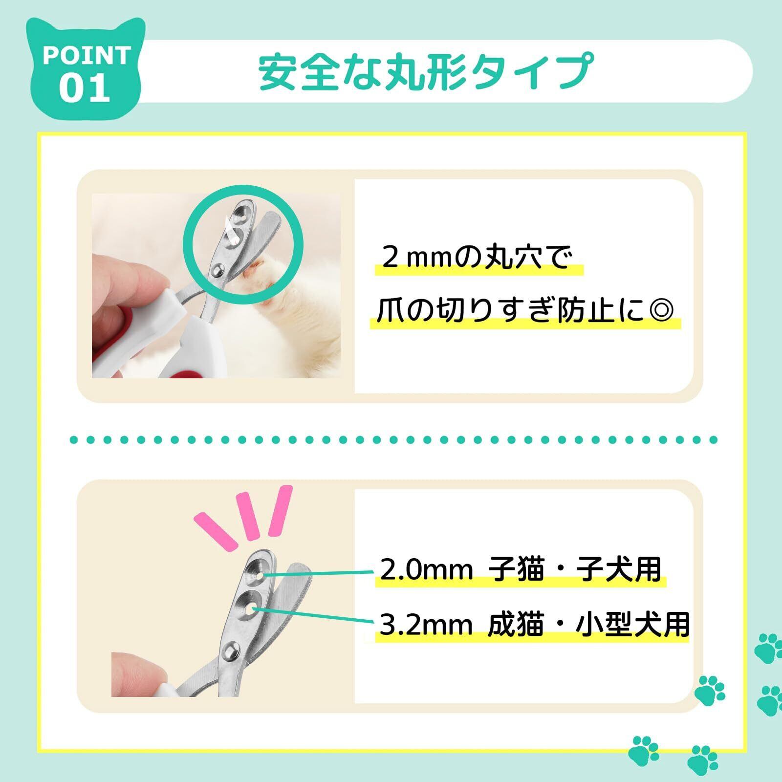 【全新ダブルホール形状設計】2mmと3.2mmの2サイズ穴を搭載した猫用爪切り。小型猫の繊細な爪には小穴、大型犬や活発な猫には大穴を選択可能。ペットの爪サイズに合わせた最適なカットが自宅で簡単に実現し、トリミングサロンへの出費と手間を削減。