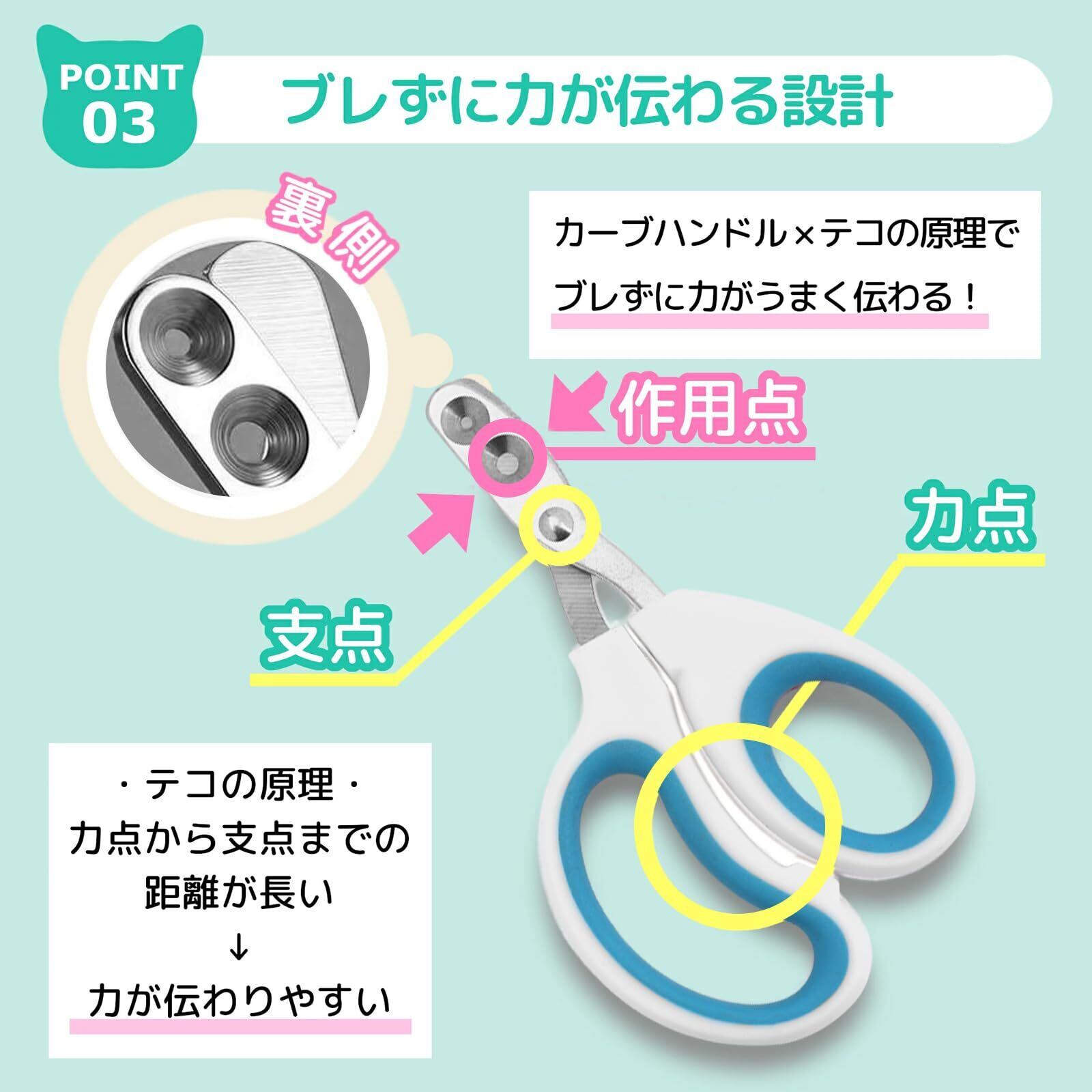 【深爪防止ガード付き】カット可能な長さを物理的に制限する安全システム。血管(クイック)への誤接触を防ぎ、初めての「つめきり」でも安心。神経質なペットのストレス軽減に最適な設計。