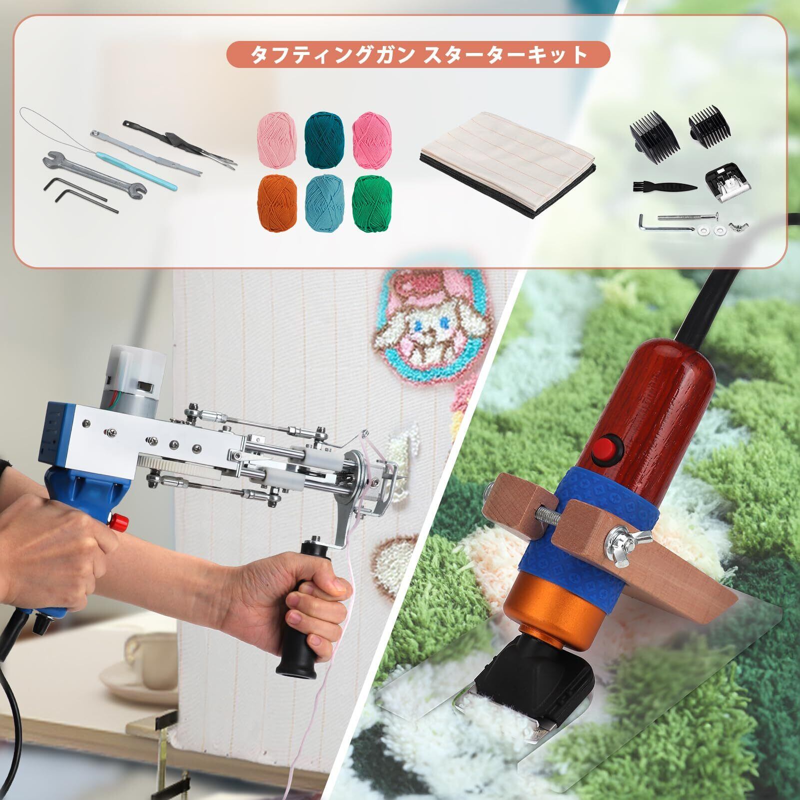 【タフティングガン セット】JTVTWタフティングガンスターターキットには、タフティングガン、カーペットトリマーキット、6ロールタフティング 毛糸、1M*1Mタフティングクロス、0.9*0.9M滑り止めバッキングクロスが含まれます