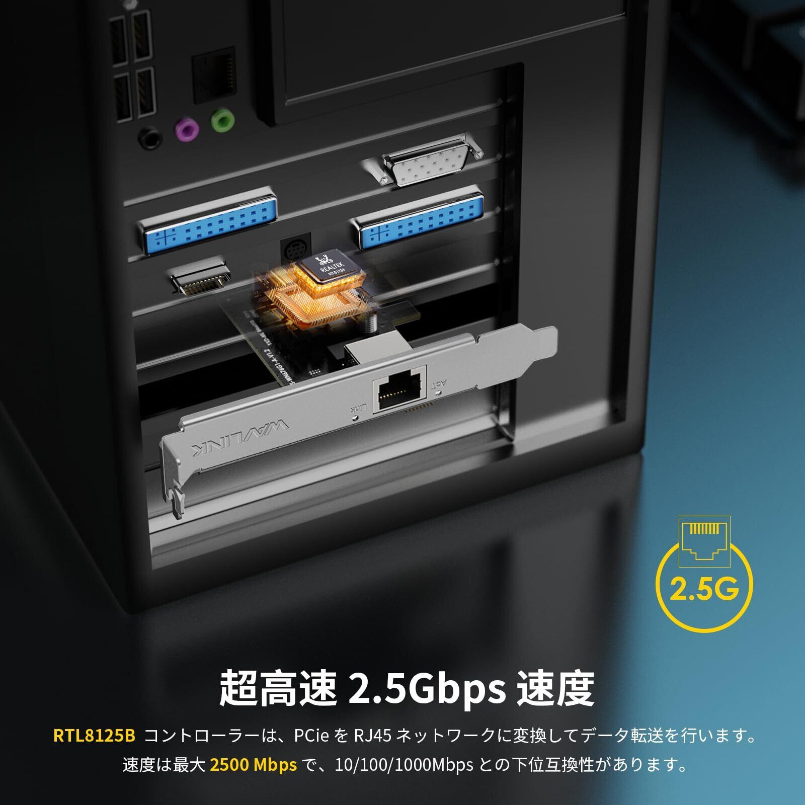 WAVLINK 2.5G Base-T LANカード PCI-E アダプター ネットワークカード 2500/1000/100Mbps PCI Express イーサネット アダプター、RTL8125B、Windows 11/10/8/8.1/7 および Linux 用 2.5G NIC、ロー プロファイル ブラケット付き