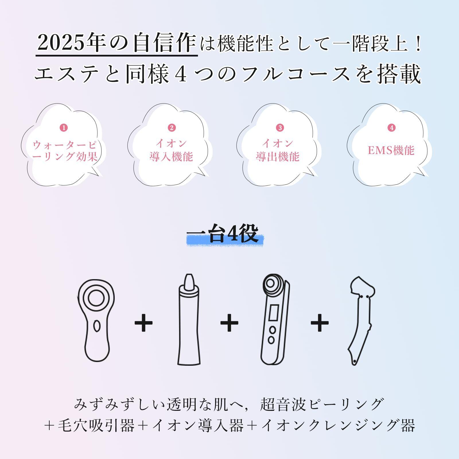 【1台5役・サロン級のフェイスケア美顔器】 超音波ピーリング・イオン導出入・EMSリフト・光エステを1台に搭載。自宅で手軽にサロン級の毛穴ケアとハリケアができる多機能美顔器。敏感肌でもやさしく使える設計。