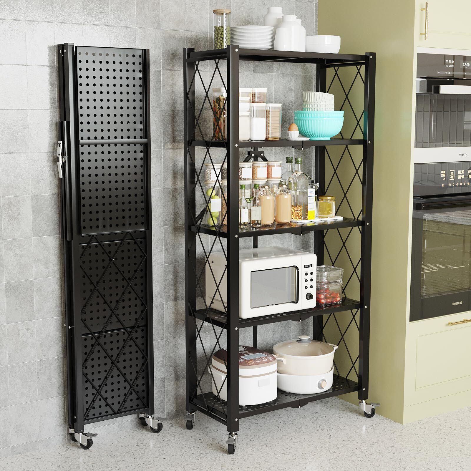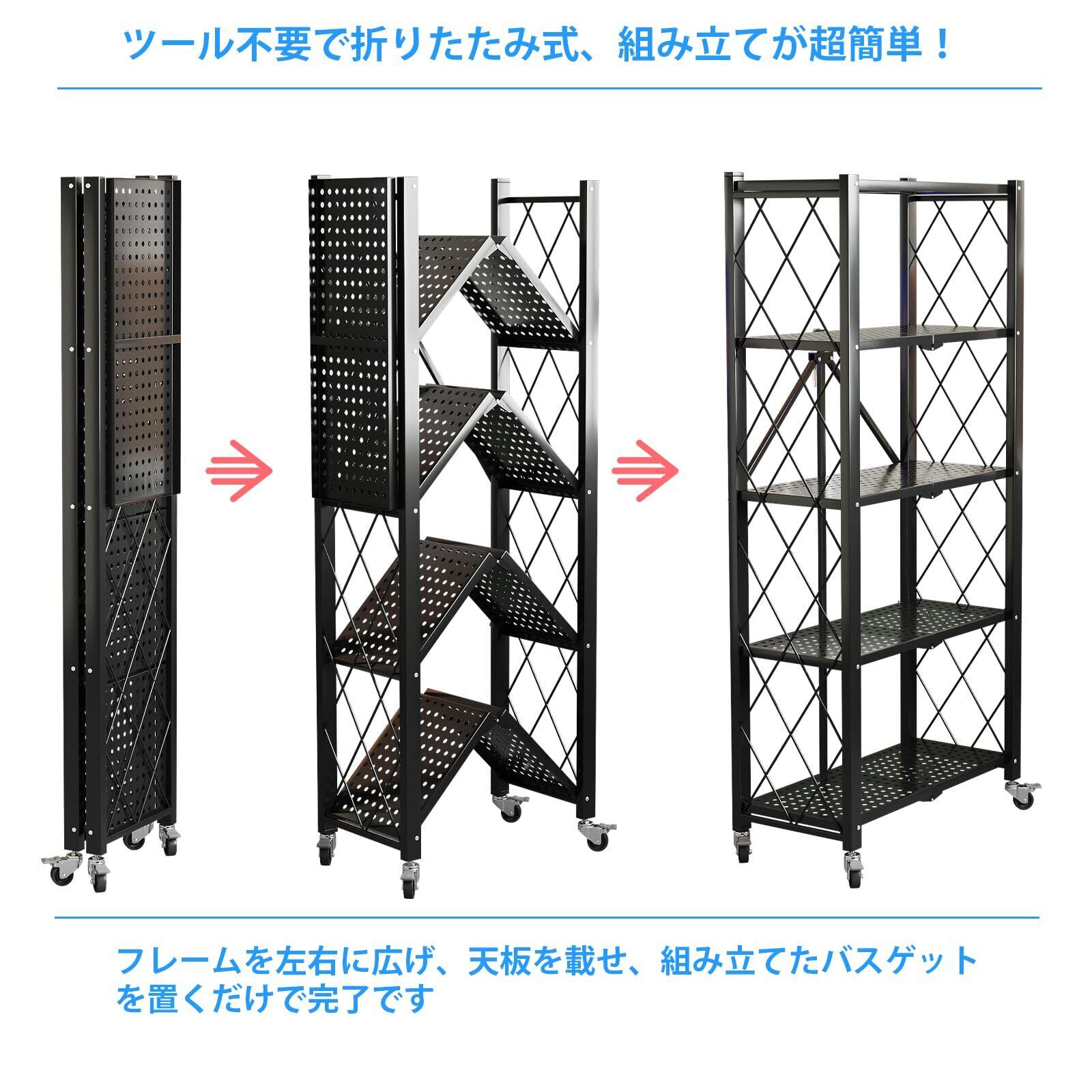 折りたたみスチールラック 5 段 折り畳み棚 スチールラック キャスター付き 移動便利 収納ラック オープンラック メタルラック レンジ台 コンパクト 多機能 大容量 組立簡単 倉庫 会社 家庭 業務用 幅71×奥行き35×高さ162cm(ブラック)