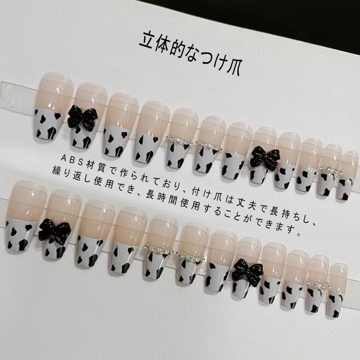 XUZOOネイルチップ 立体 付け爪 つけ爪 かわいい おしゃれ 人気 シンプル 花嫁 結婚式 付け爪 クリスタル パール 蝶 花 立体 3Dネイルチップ 短め 長め 手用 ネイルシール つけ爪 ネイルツール 両面テープ付き 24枚 (乳牛色とリボン)