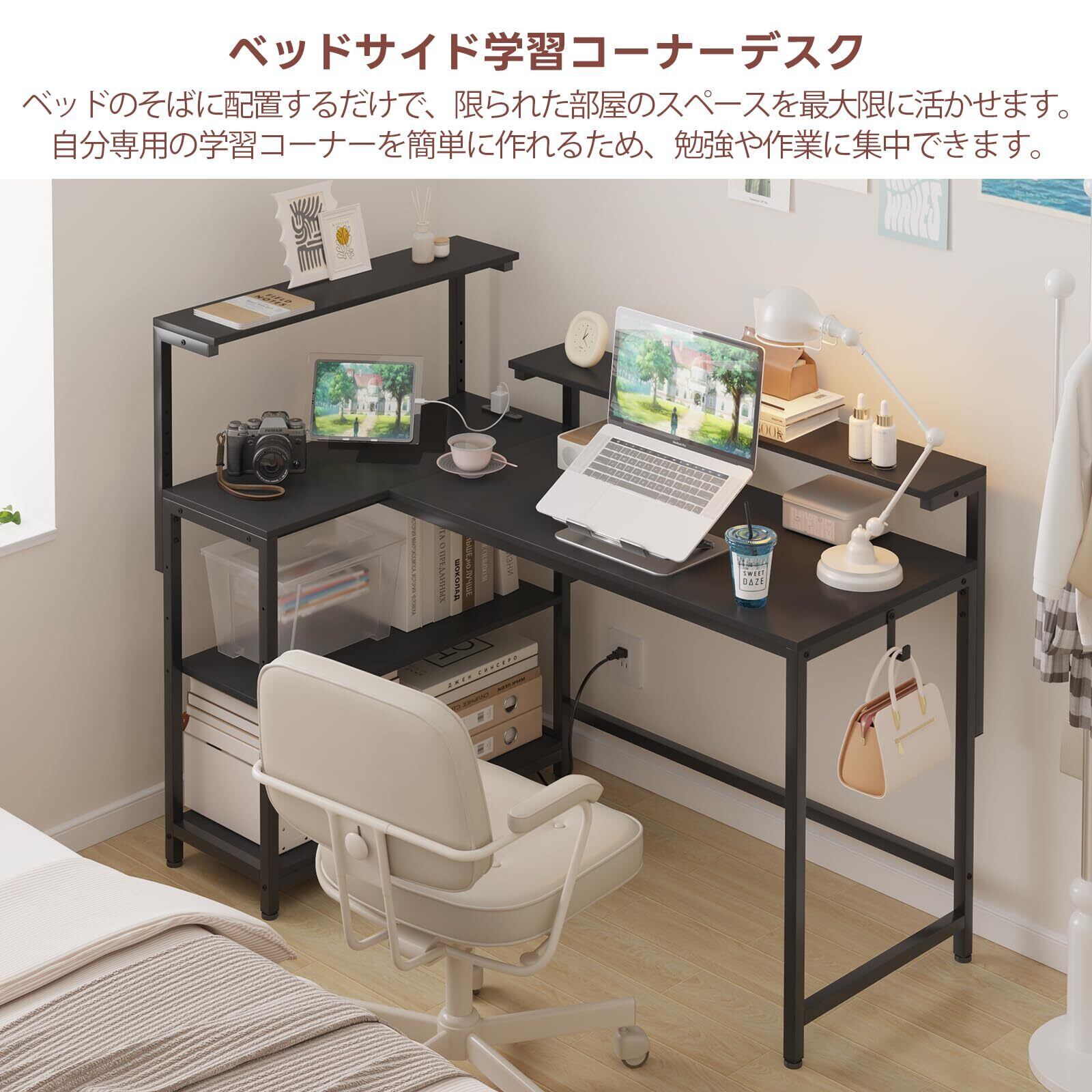 【多機能収納ラック】収納ラックの棚板は3段階の調節が可能なため、パソコン本体だけでなく他の物も自由に収納可能です。付属の2台のモニター台は、いずれも7段階高さ調節機能を搭載。パソコンや資料を置ける広々としたL型天板で、勉強やテレワークに最適です。