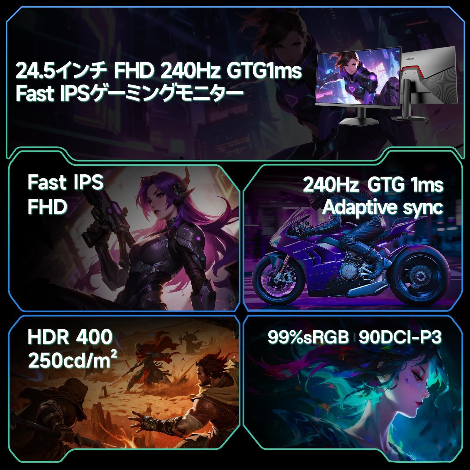 KOORUI ゲーミングモニター 24.5インチ FHD 240Hz GTG1ms応答速度 Fast IPSパネル 250ni輝度 HDR400/DCI-P3 90%/sRGB 99%/Adaptive Sync/HDMI/DP VESAマウント対応 PC モニター G2511X