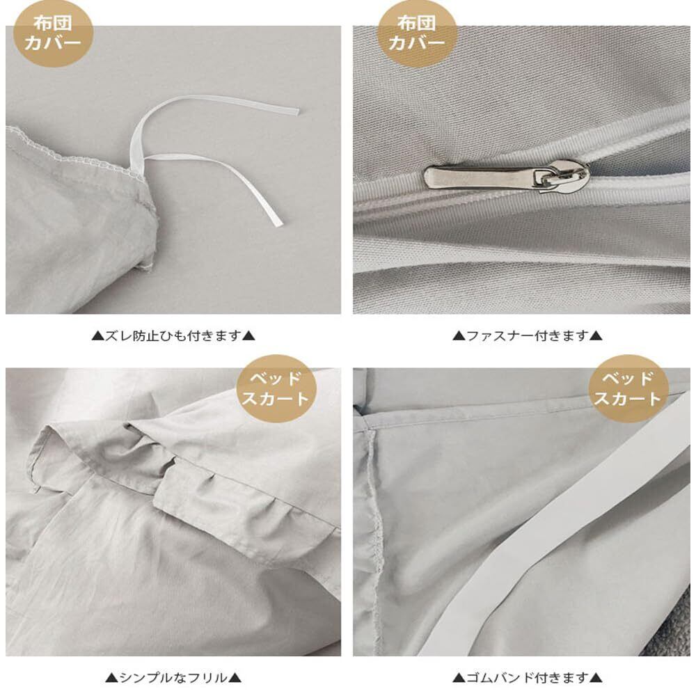 【シングル3点セット】 布団カバー:150×210cm ベッドスカート:105×210cm+45cm(マチ) 枕カバー:46×63cm×1枚 【セミダブル4点セット】 布団カバー:170×210cm ベッドスカート:125×215cm+45cm(マチ) 枕カバー:46×63cm×2枚【ダブル4点セット】 布団カバー:190×210cm ベッドスカート:145×215cm+45cm(マチ) 枕カバー:46×63cm×2枚