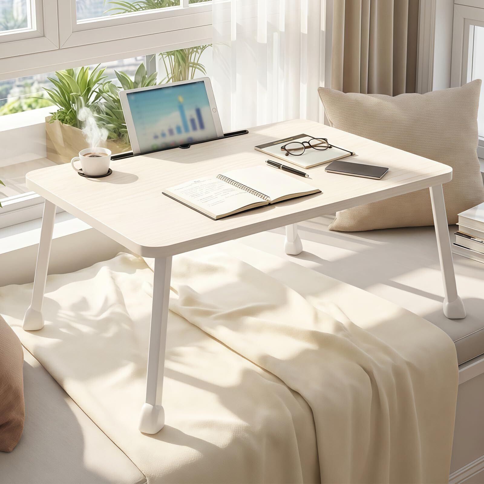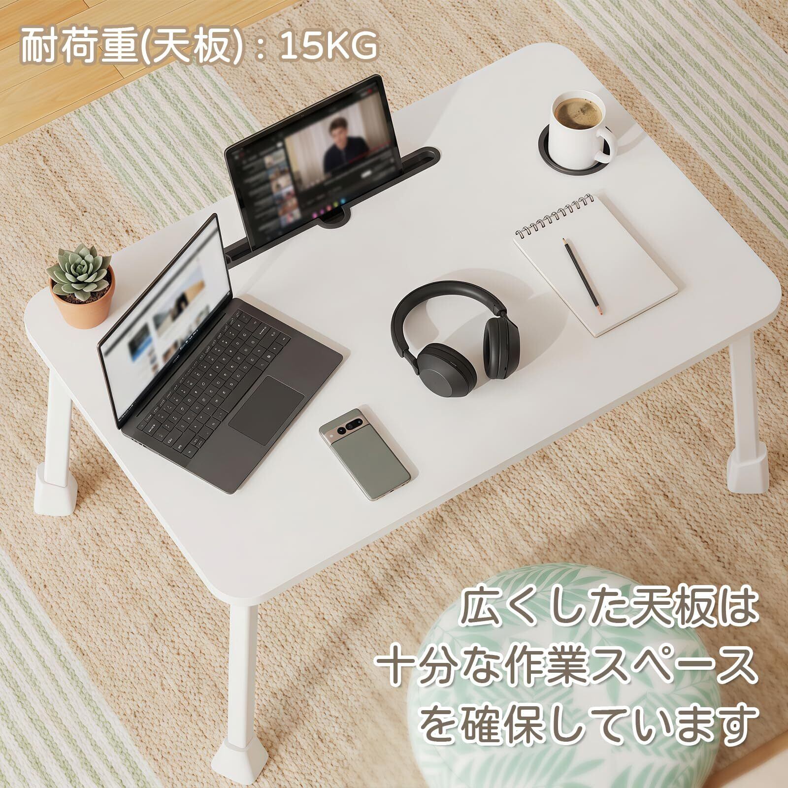 ローテーブル 折りたたみテーブル ちゃぶ台 幅70cm*奥行40cm*高さ34cm ベッドテーブル 組み立て不要 パソコンデスク リモートワーク ミニテーブル 座卓 コンパクト タブレットスタンド ドリンクホルダー付き 持ち運び便利 ホワイト