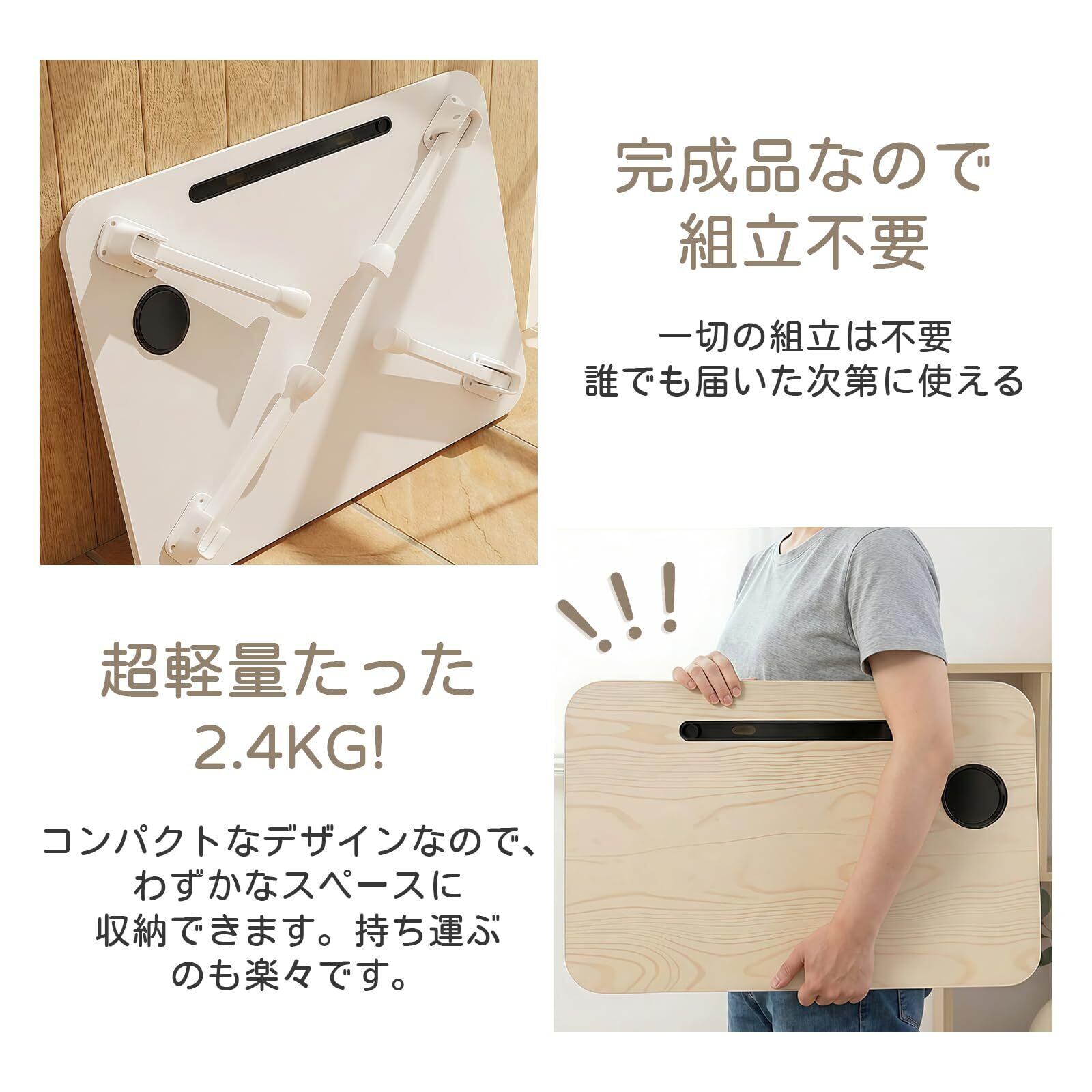 【折り畳み式・組立不要】面倒な組み立ては不要です。コンパクトなテーブルは限られたスペースを有効に活用するために最適な選択です。折りたたみ後はスリムな形状になるため、部屋の隅やクローゼットの中など、狭い場所にも楽に収納可能です。また、持ち運びもしやすく、様々な場所で活用できる汎用性も持っています。必要な時にすぐに取り出して使用できるため、スペースが限られた住宅やオフィス、キャンプやピクニックなど、どんな場面でも重宝します。