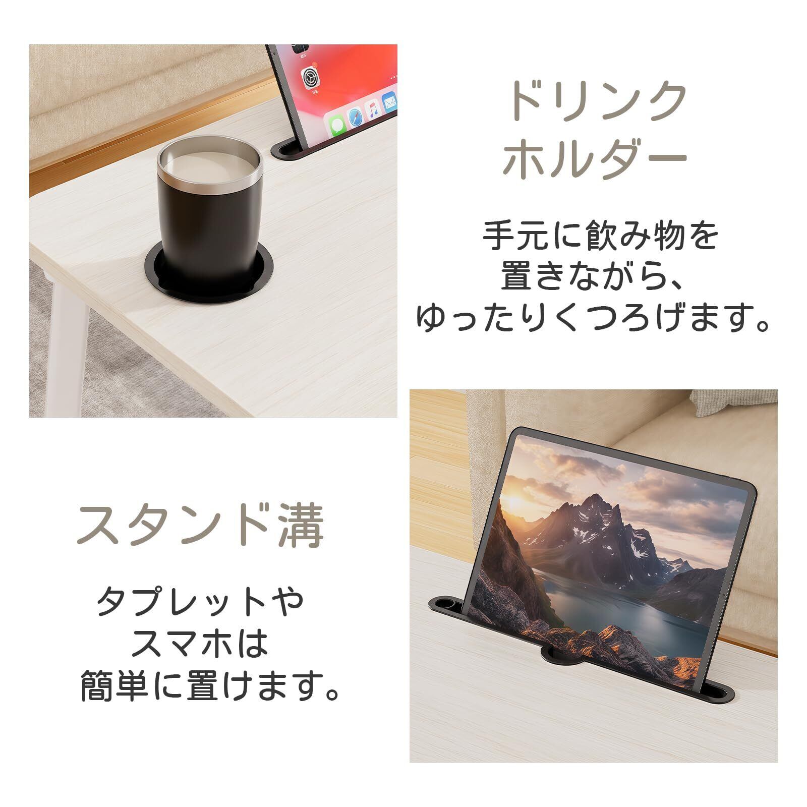 【製品規格】製品サイズ:幅70*奥行40cm*高さ28cmタブレットスタンドとドリンクホルダーが配置しています。