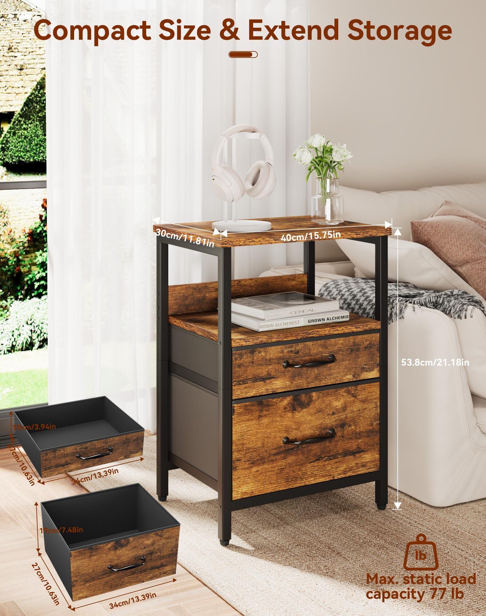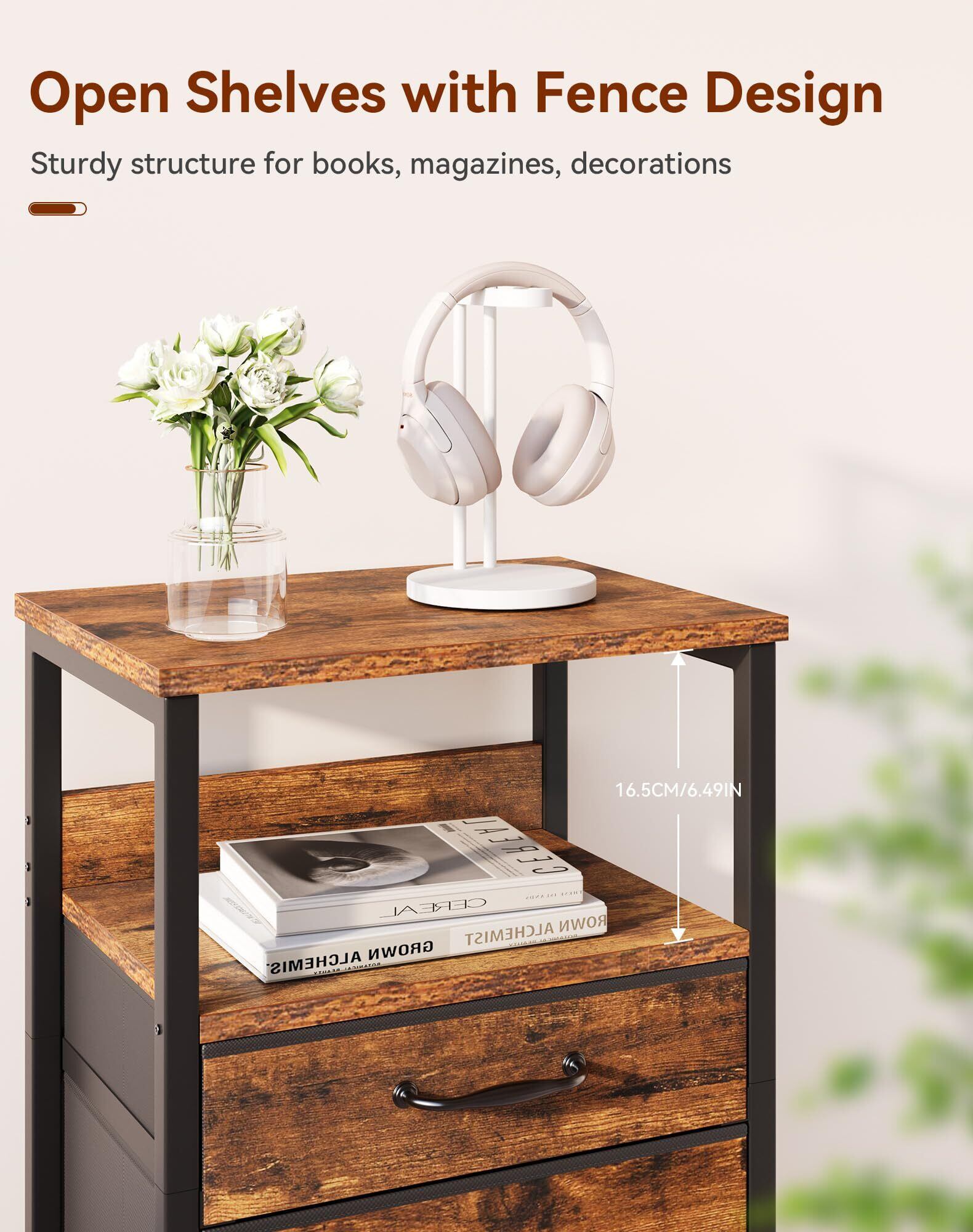 YMYNY サイドテーブル ナイトテーブル ファブリック引き出し付き 木目 アイアン&木製 組み立て簡単 コンパクト ナイトスタンド ベッドサイドテーブル ベッド横 ソファー横 ブラウン HST011H