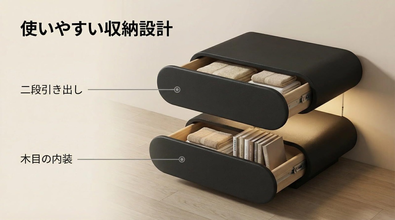 ナイトテーブル 引き出しの前面に上質な超繊皮を採用。シンプルな纯色で現代的な雰囲気を演出し、耐久性・耐汚れ性に優れています。2段引き出しとオープンスペースで小物を整理でき、3サイズ(40/45/50×40×48cm)の展開で一人暮らしからファミリーまで対応。ベッド周りをすっきりさせ、清潔感のある空間を実現します。
