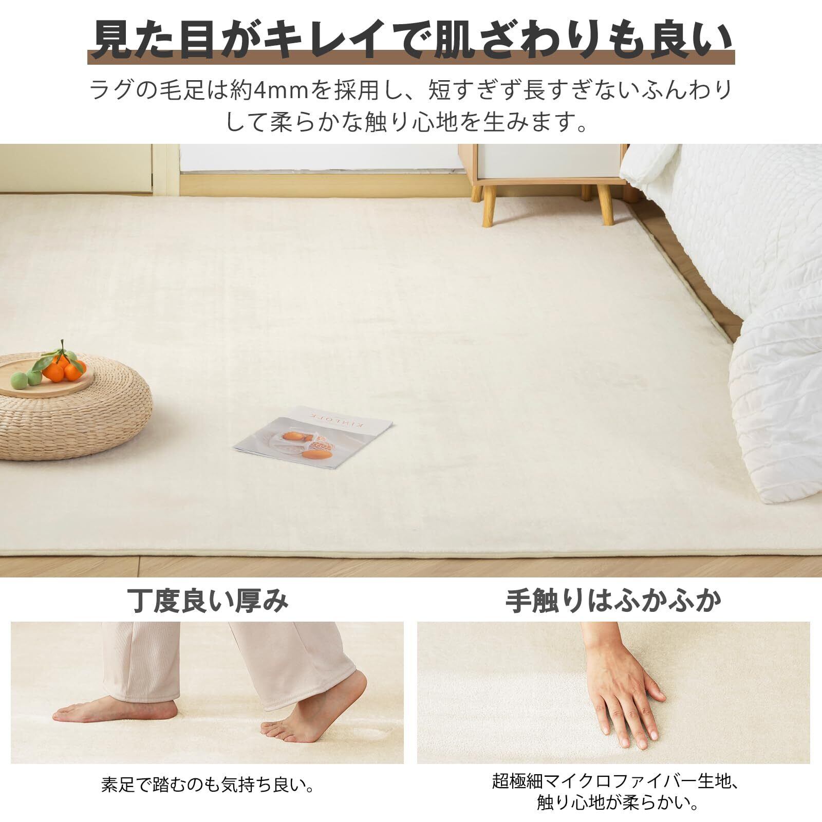 ✨【ラグ仕様】カラー:アイボリー 長方形ラグ 1.5畳 135x185cm 。起毛の高さ:約4mm、ウレタン厚:加工前約6.5mm、 絨毯表地:ポリエステル100% 中材:ウレタンフォーム 裏地:ポリエステル100%(不織布)【品質】商品輸送の際に折りたたんでお届けするため、開封時に折りジワ、歪み・寸法不足等の変形がありますが、ラグマットを広げて一週間ほどご使用になれば、ゆっくりと回復します。万が一商品に不具合がある場合、商品自体の問題がある場合は、にご連絡いただければ迅速に対応いたします。のラグにご満足いただけない場合、いかなる理由でもご返品いただけます。ご安心してお買い求め頂けます。