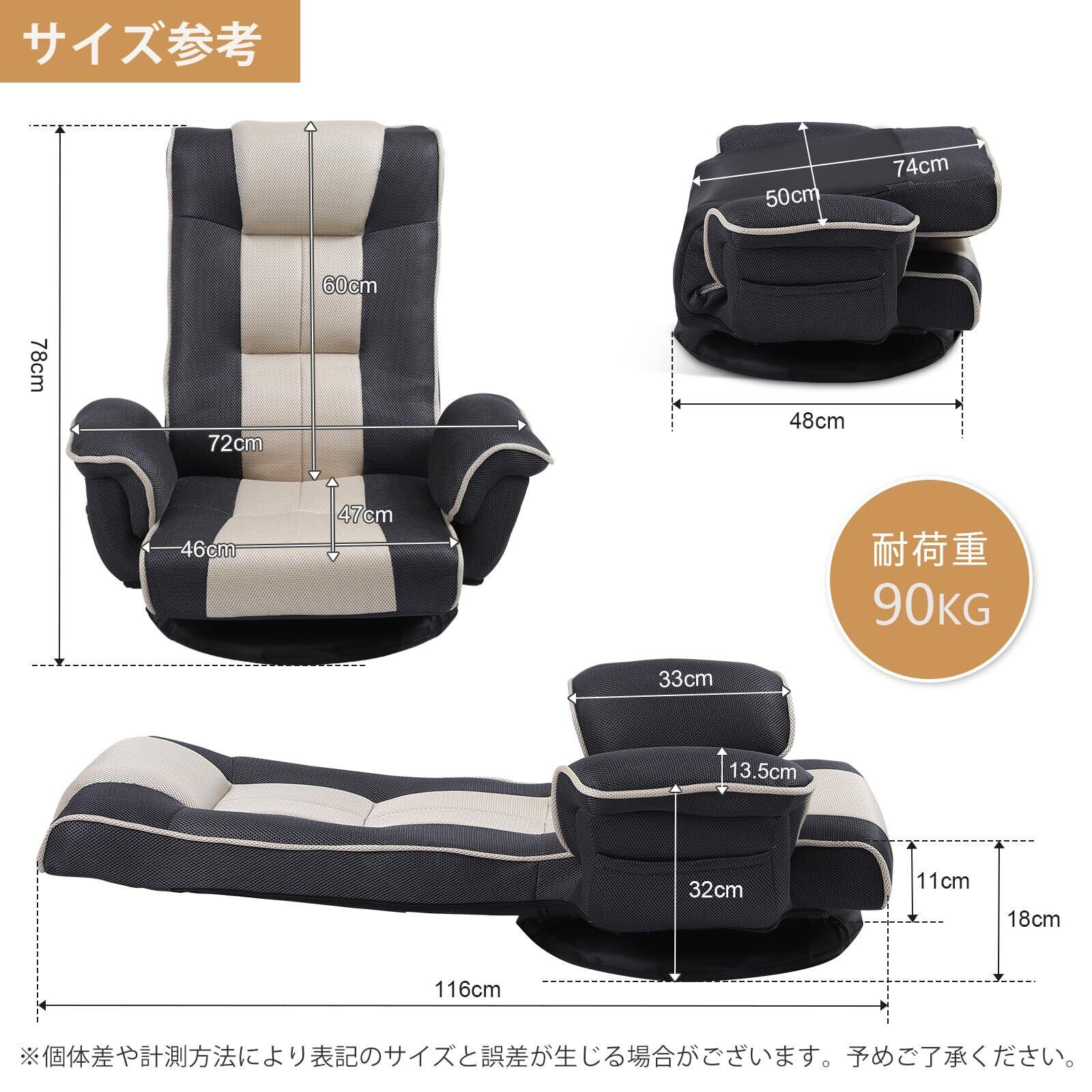 【素材】:鋼管、低反発ウレタン、メッシュ。【サイズ】座椅子の外寸:幅72cm×奥行48cm×高さ78cm 。座面サイズ:座面の幅46㎝×座面の奥行47㎝×座面の高さ18cm / 肘掛の高さ:32cm。重量:約8.5kg。耐荷重:約90kg。座椅子ソファー(1人掛け)フラット時の外寸:幅72cm×奥行116cm×高さ18cm 。