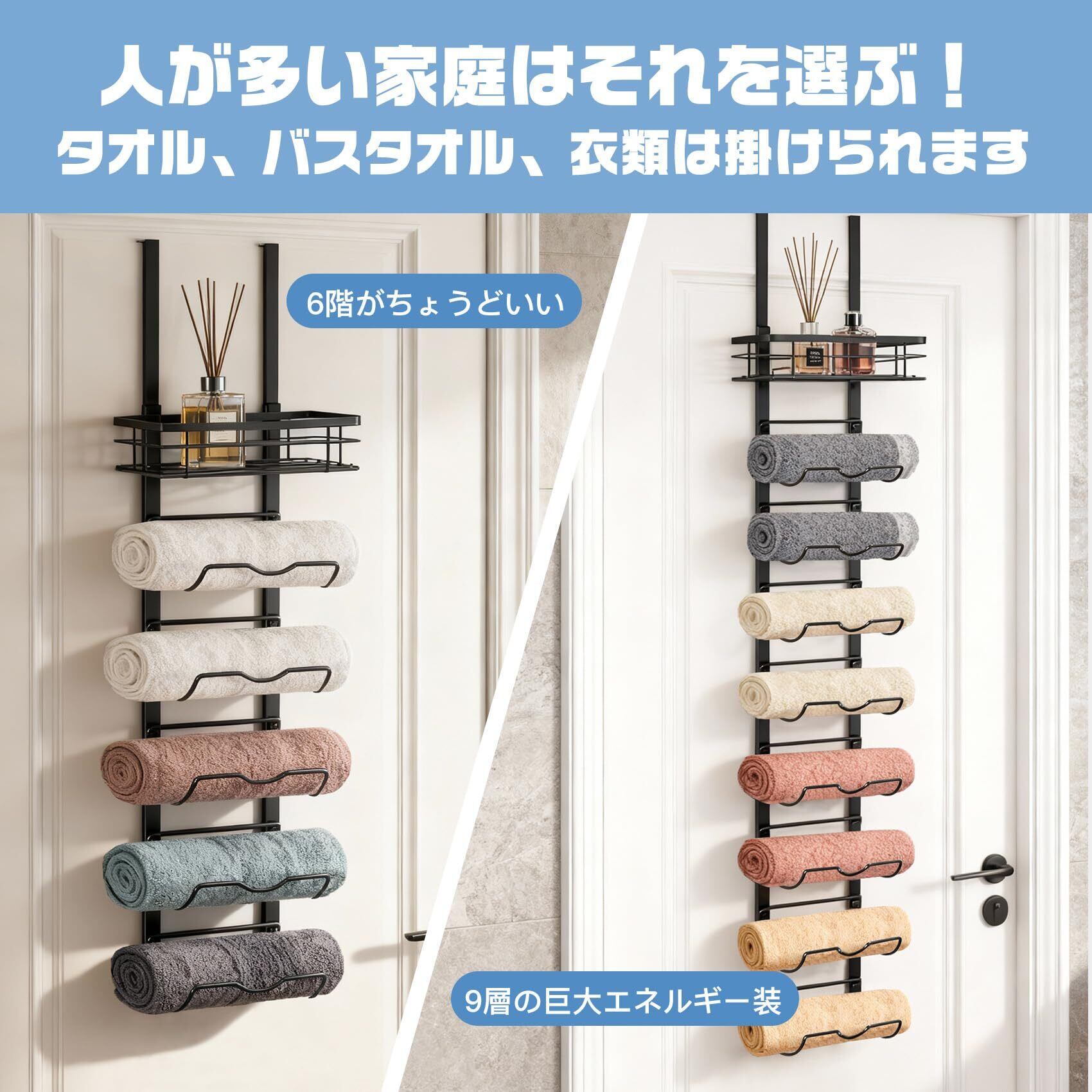 タオル掛け ハンギング バスルーム用 ノードリル 6段オーバーザドア バスタオル収納オーガナイザー 小さなバスルーム用 段違いドア裏タオルホルダーハンガー 巻きタオル用 ブラック