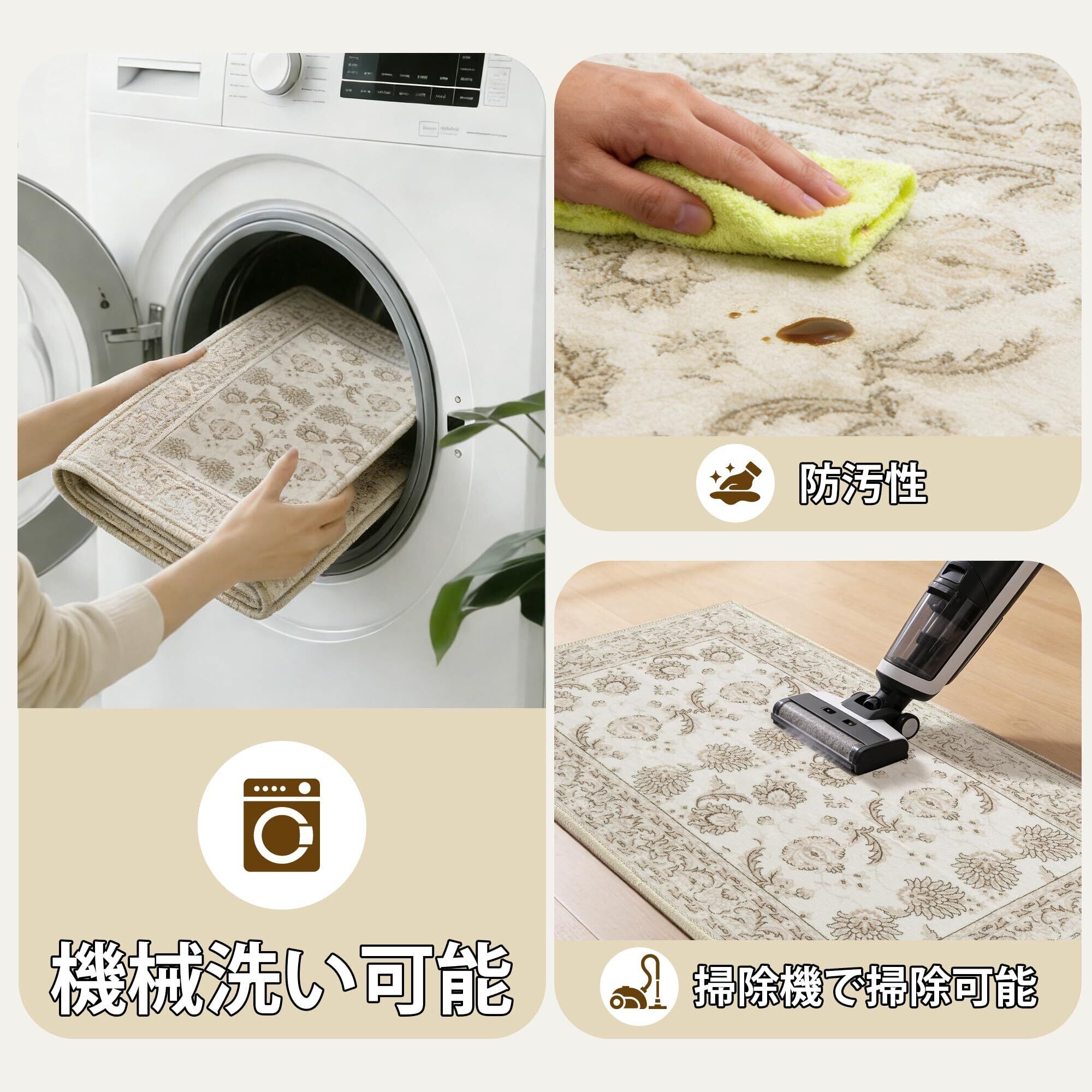 【簡単クリーニング】表面の防水コーティングで、水しみや軽度の液体の浸透を効果的に防ぎます。掃除機、ほうきでの掃除や、マットを軽く叩いたり振ったりするだけで表面の埃を除去できます。汚れた場合は家庭用洗濯機で直接洗濯可能(洗濯袋使用を推奨)。常に清潔な状態を保ち、衛生的で安心です。