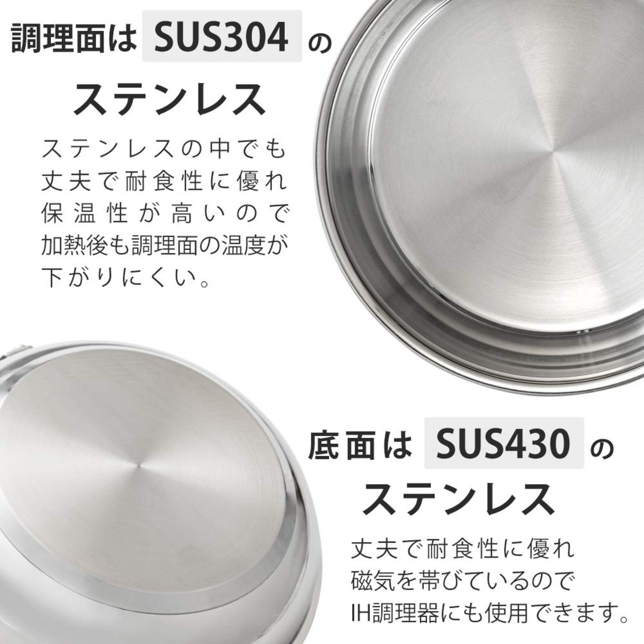 材質:本体:ステンレス鋼(クロム18%、ニッケル8%)、取手:ステンレス鋼(クロム16%、ニッケル6%)、はり底:アルミニウム合金、ステンレス鋼(クロム16%)