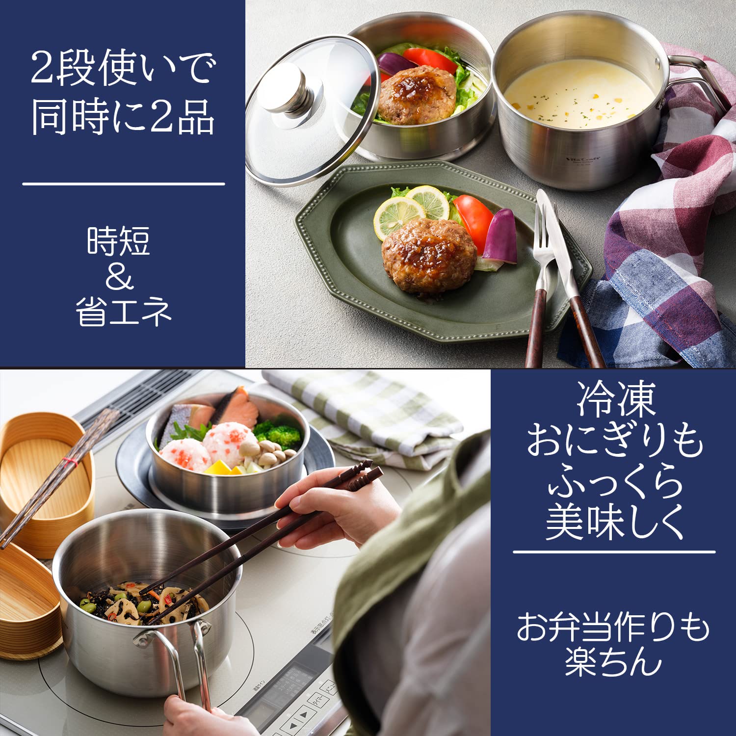 2段使いで時短&省エネ、スチーム、少量の水で蒸す、少量の油で揚げる、炊く、茹でる、煮る、炒める、沸かすと1台9役の実力派。 蒸し器と2段使いができるので1度に2品。時短&省エネ。 スタイリッシュでコンパクト、収納場所にも困らない。 スチーマーの底面は食材がこびり付きにくい凹凸形状。 中が見える強化ガラスにスタイリッシュなブラックライン。 本体はステンレス仕様で洗い易く清潔。注ぎ口も水切れ抜群。 メモリ付きで計量も簡単。