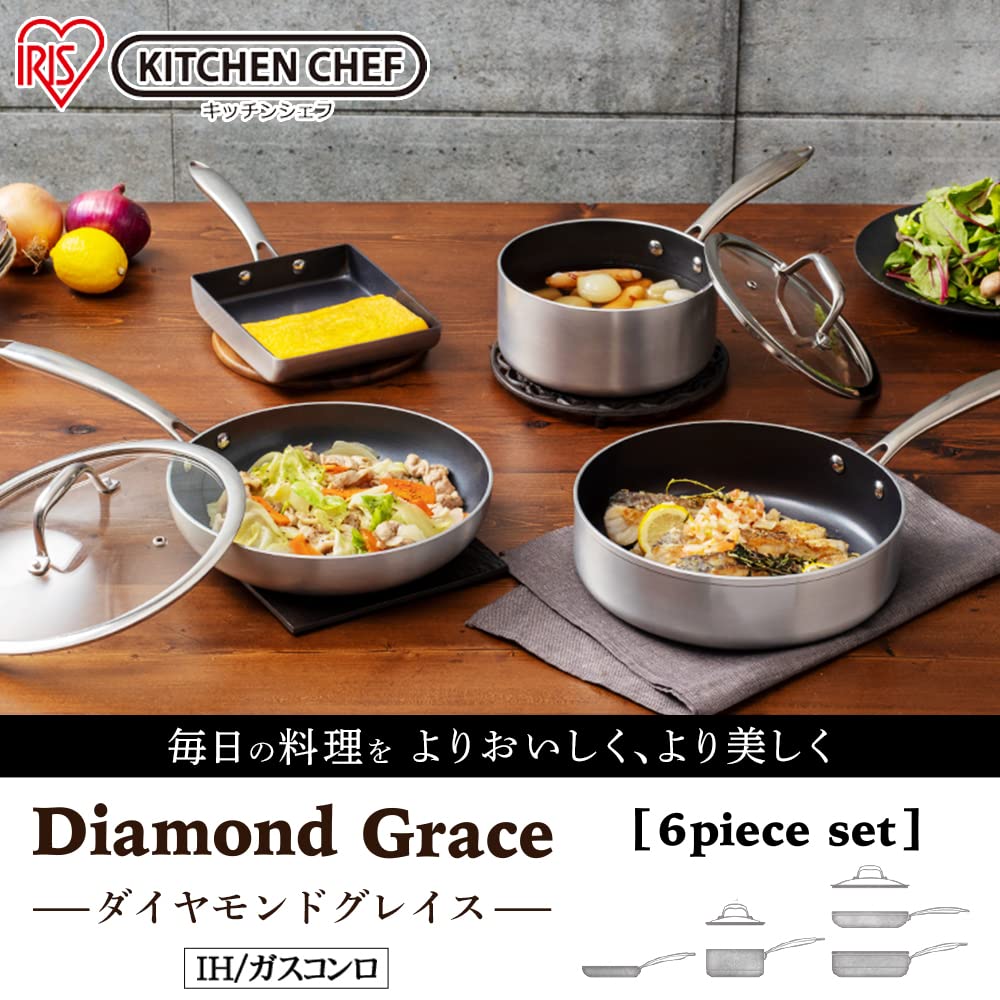 アイリスオーヤマ フライパン 鍋 6点セット 26㎝ 20㎝ IH 対応 ダイヤモンドグレイス シルバー KITCHEN CHEF DG-SE6