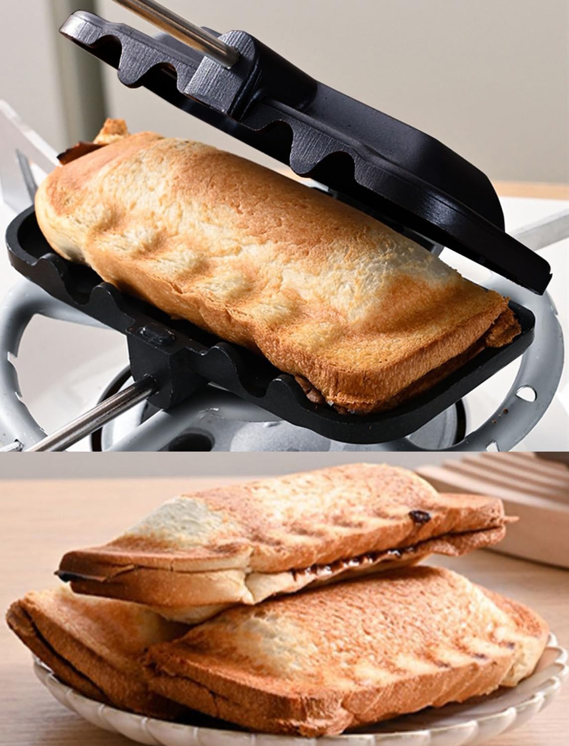 【独自の分離式設計と使いやすさ】最大の特徴は、木製ハンドルと加熱部分が4つに分解できる点です。これにより、洗浄や収納が非常に楽になります。特にパンくずの処理や油汚れが気になる部分を簡単に分離して洗えるため、衛生面でも優れています。圧着式の構造により、パンをしっかり囲み、中身の具材がはみ出しにくく、サクッとした耳とフワッとした中央という2種類の食感を楽しめるホットサンドを作り上げます。